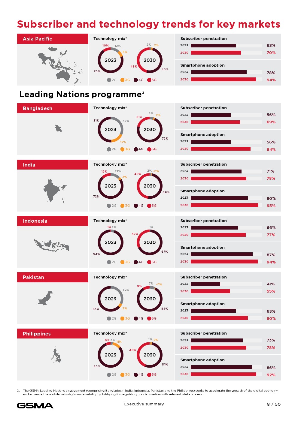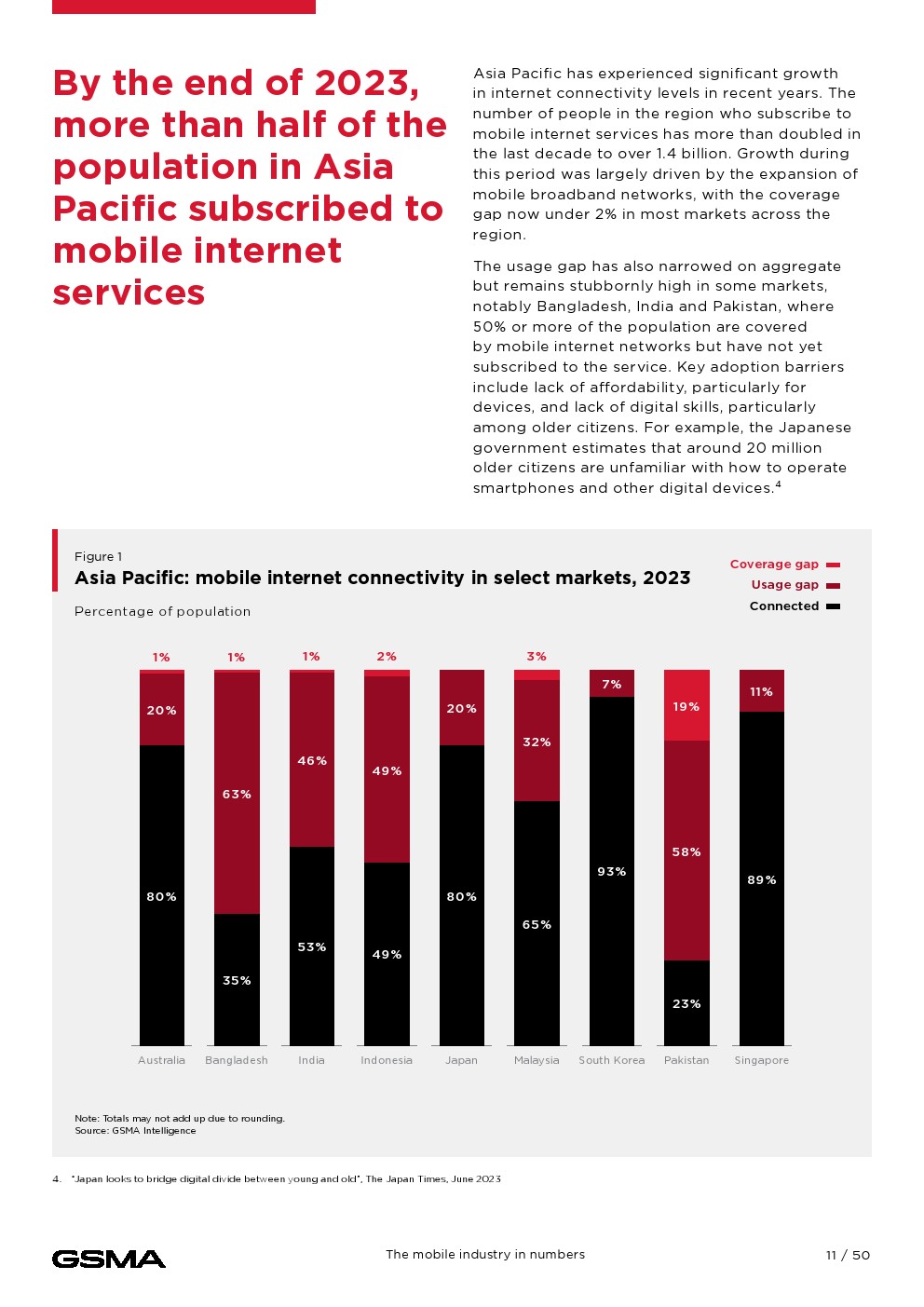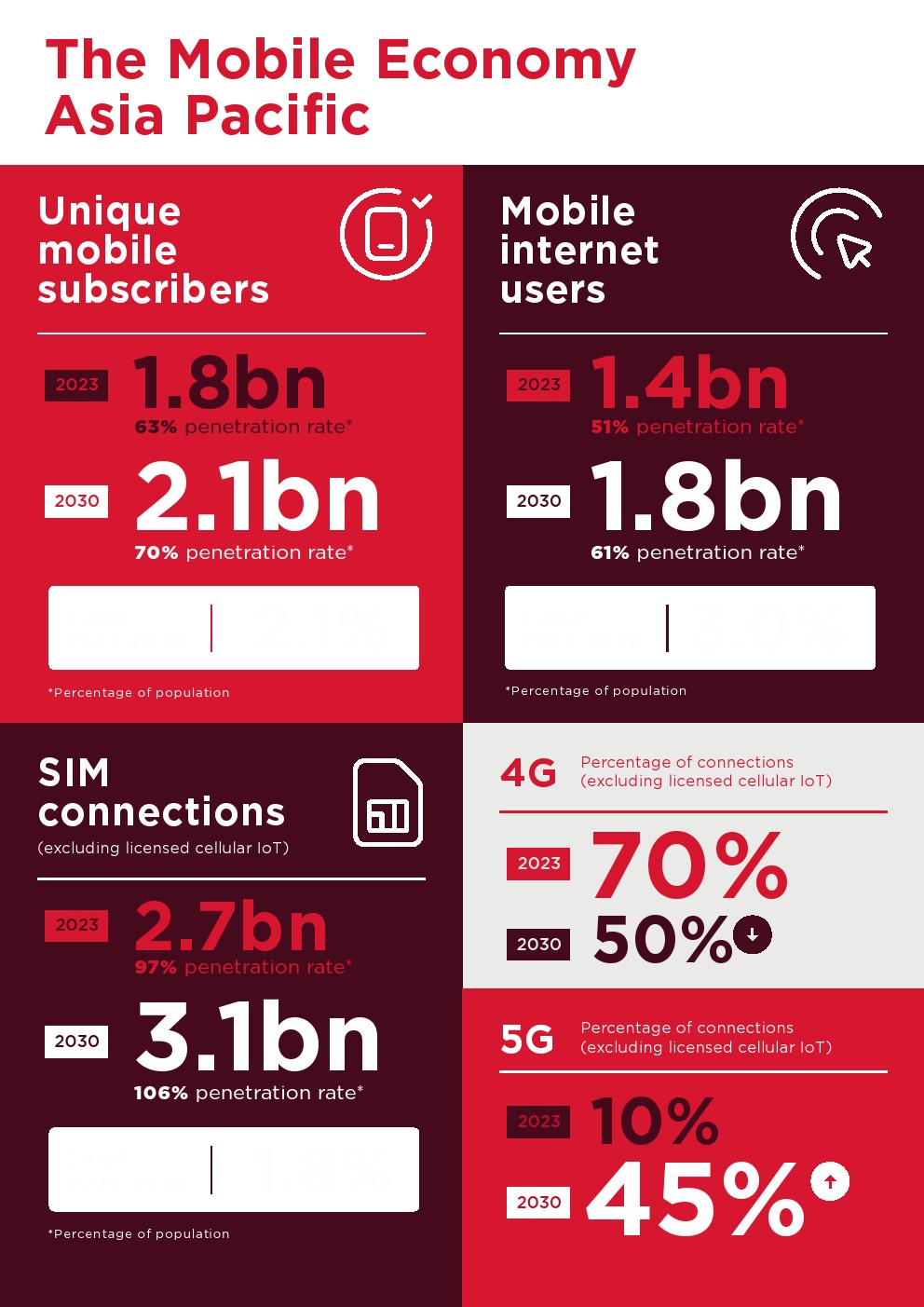 到2023年底,亚太地区将有18亿人(占总人口的63%)订阅移动服务。移动互联网普及率的增长非常显著。到2023年底,该地区51%的人口使用移动互联网,相当于14亿多用户,几乎是十年前的三倍。