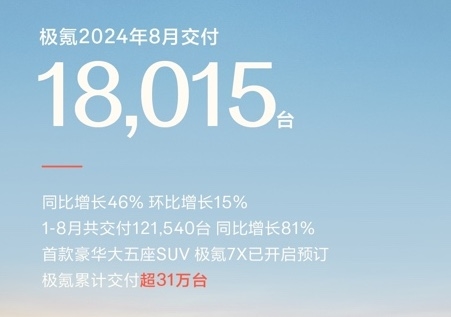 从极氪官方获悉,极氪8月交付18015台,同比增长46%,环比增长15%,同环比双增长。