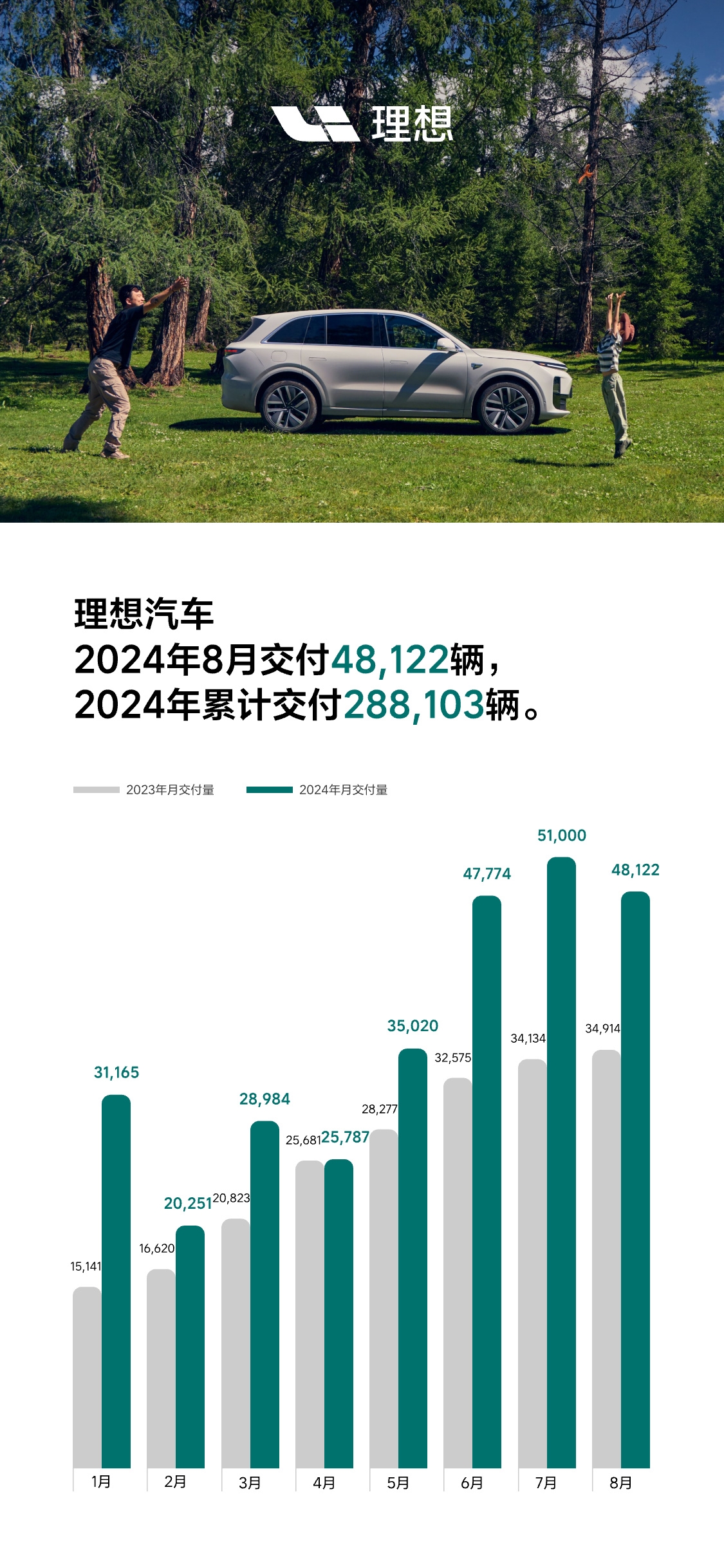 理想汽车发布了8月份销量战报,理想8月份共计交付48,122辆,同比增长37.8%。今年1月至8月共计交付288,103辆;截至2024年8月31日,理想汽车累计交付921,467辆,接近百万辆大关。