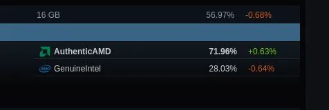部分原因是 Steam Deck 采用了定制的 AMD APU,AMD CPU 在 Steam Linux 游戏玩家中的市场份额仍超过 70%。