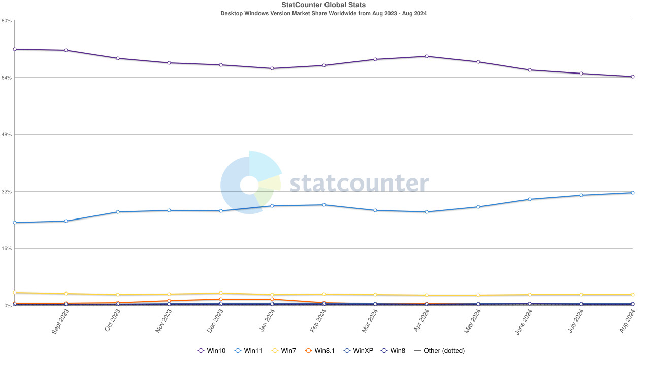 Statcounter 报告称,2024 年 8 月,Windows 11 的使用率达到 31.63% 的历史新高,比上月增长了 0.8 个百分点。同比增长 8.46 个百分点(2023 年 8 月为 23.17%)。这与 Windows 10 仍有相当大的差距,后者的用户数量是其继任者的两倍。