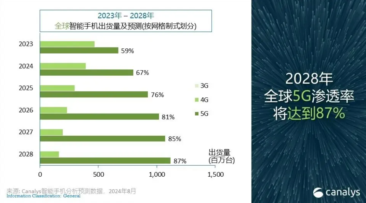 5G智能手机市场渗透率预计2024年将达67%,到2028年上升至87%。