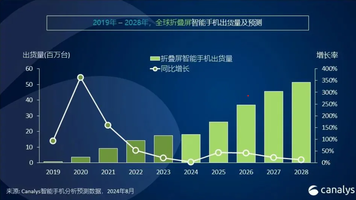 折叠屏手机市场预计2024年出货量约1800万台,同比增长3%,2024至2028年将以30%的年复合增长率增长至5100万台。