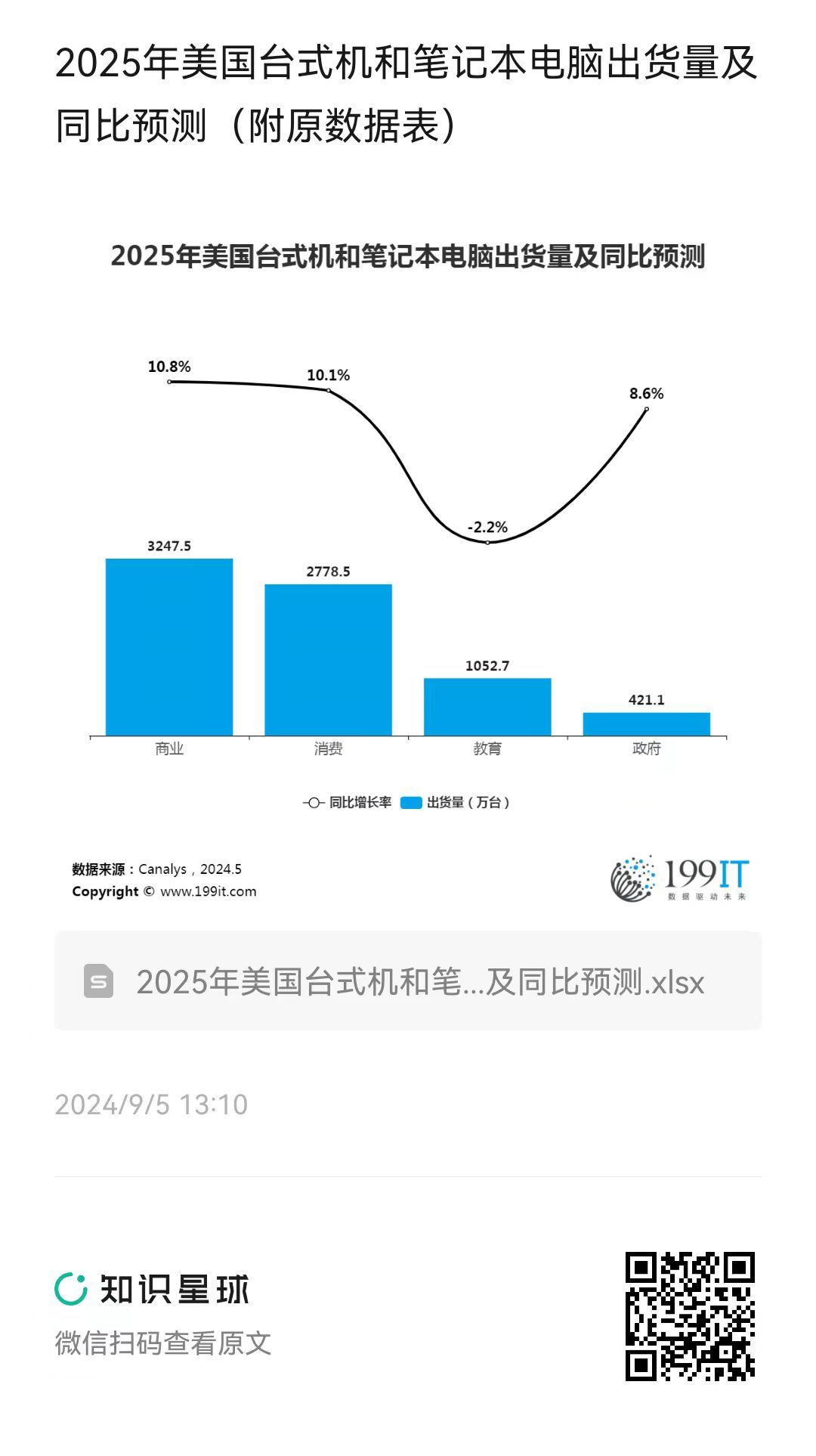- 2025年美国主要部门台式和笔记本电脑出货量及同比预测(附原数据表)