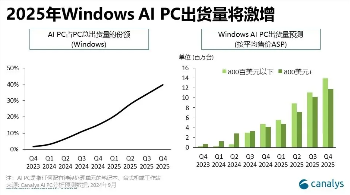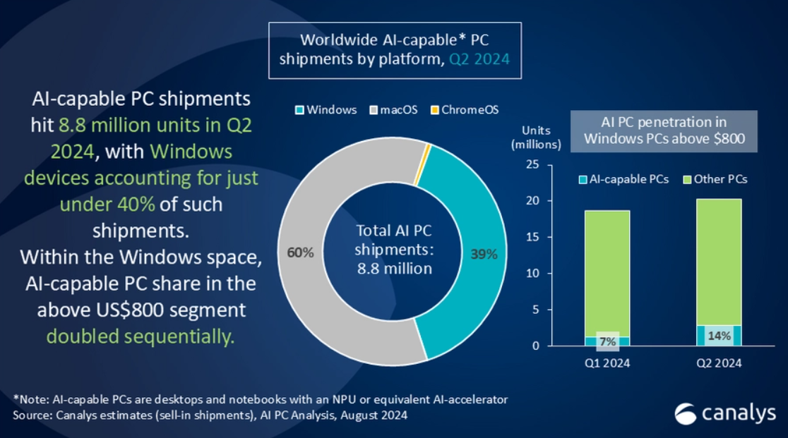数据显示,第二季度全球AI PC出货量为880万台,占个人电脑总出货量的14%,Windows领域AI PC出货量环比增长127%。