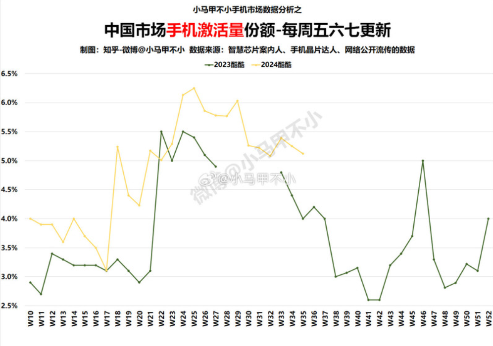 从激活量份额的走势图可以看出,iQOO手机在今年早些时候的市场份额基本维持在4%以下,但从第18周开始,其市场份额突然猛增至5%以上,并在随后的15周时间里稳定在5%以上,最高时甚至超过了6%。