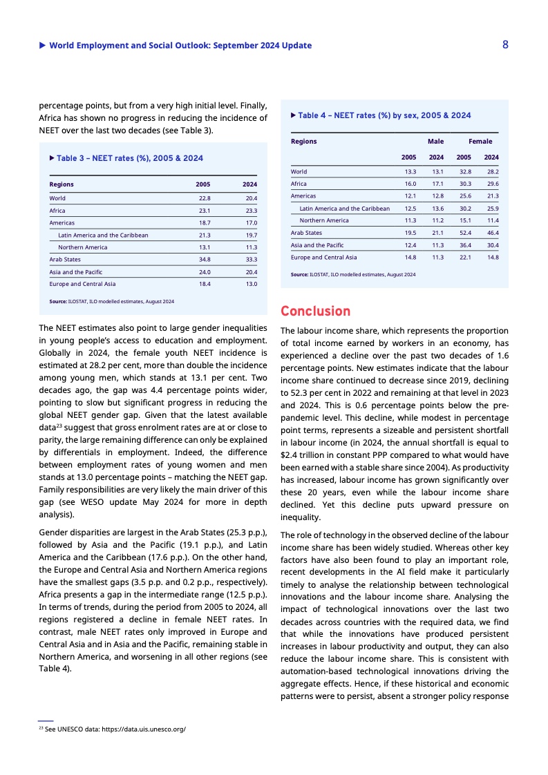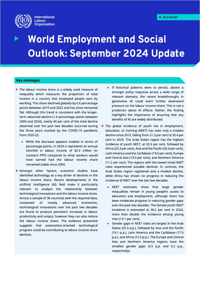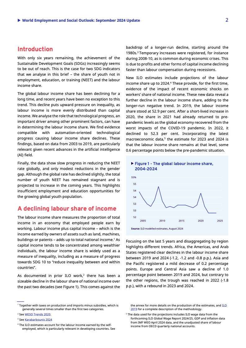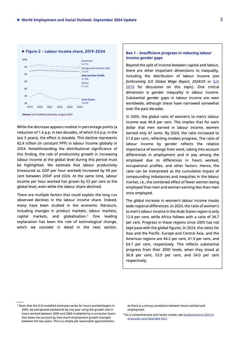 在一份有关全球就业的定期更新报告中,劳工组织引用了来自36个国家的数据,指出从2019年到2022年,全球总收入下降了0.6个百分点,而此后一直保持平稳。