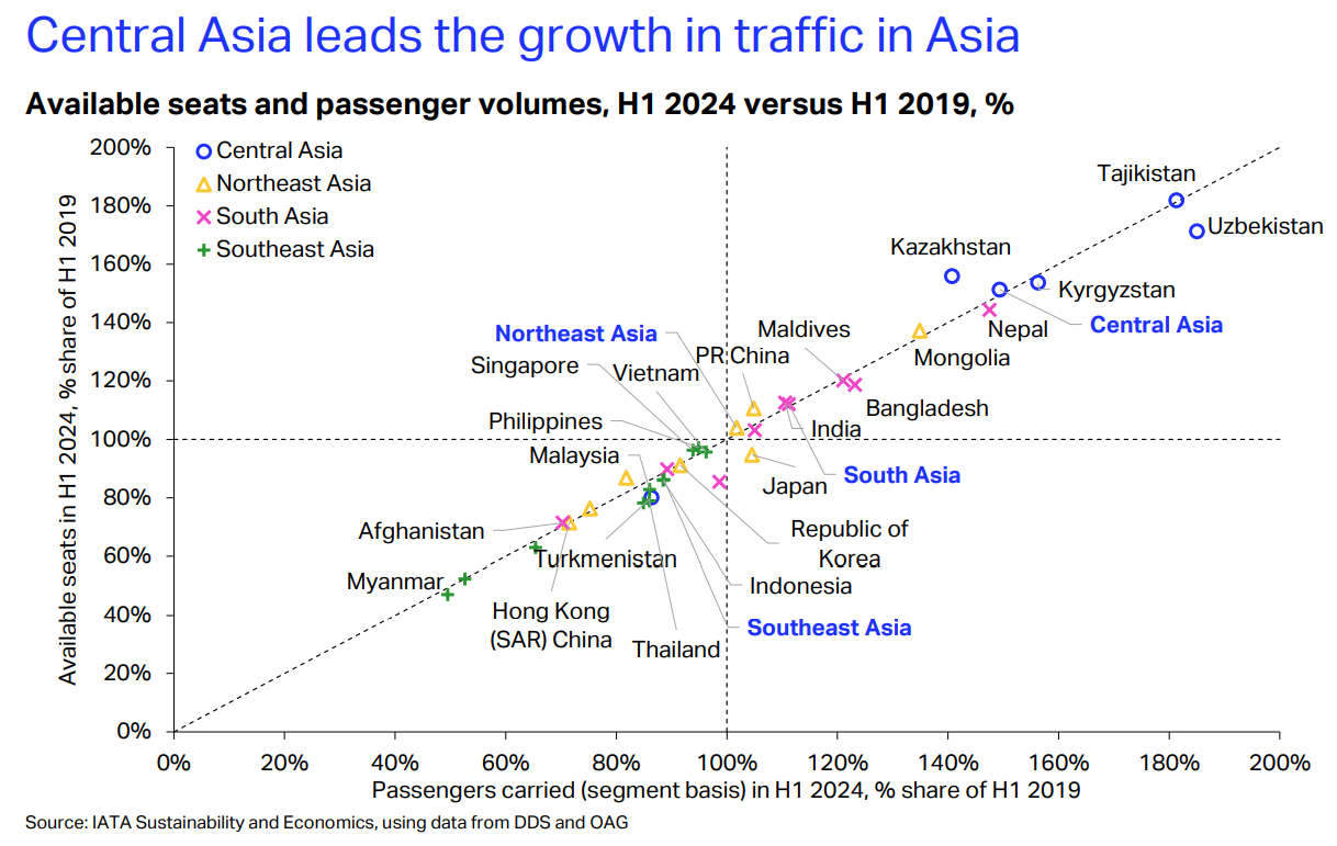 航空运输量的增长是由亚洲地区推动的,中国在取消新冠肺炎限制后迎头赶上。但在本地区表现最为突出的是中亚。2024年上半年,在国内外市场的推动下,塔吉克斯坦和乌兹别克斯坦的客运需求和座位供应比2019年增长了80%以上。与2019年相比,该区域除土库曼斯坦外的所有国家在2023年都开通了更多的直航航班。