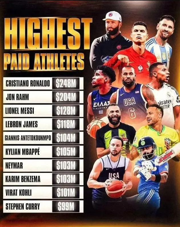 此外,篮球领域的勒布朗·詹姆斯和字母哥(扬尼斯·阿德托昆博)也表现不俗,分别以1.18亿欧元和1.05亿欧元的年收入位列第四和第五。
