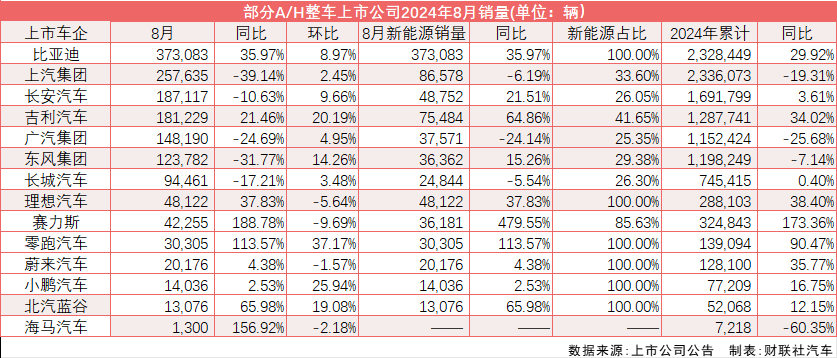 财联社记者统计14家A/H股上市车企8月销量显示,新能源汽车销量占比超过40%的8家车企,在8月均实现了销量增长;而5家车企新能源汽车销量占比偏低,在8月均遭遇了两位数的销量下滑。