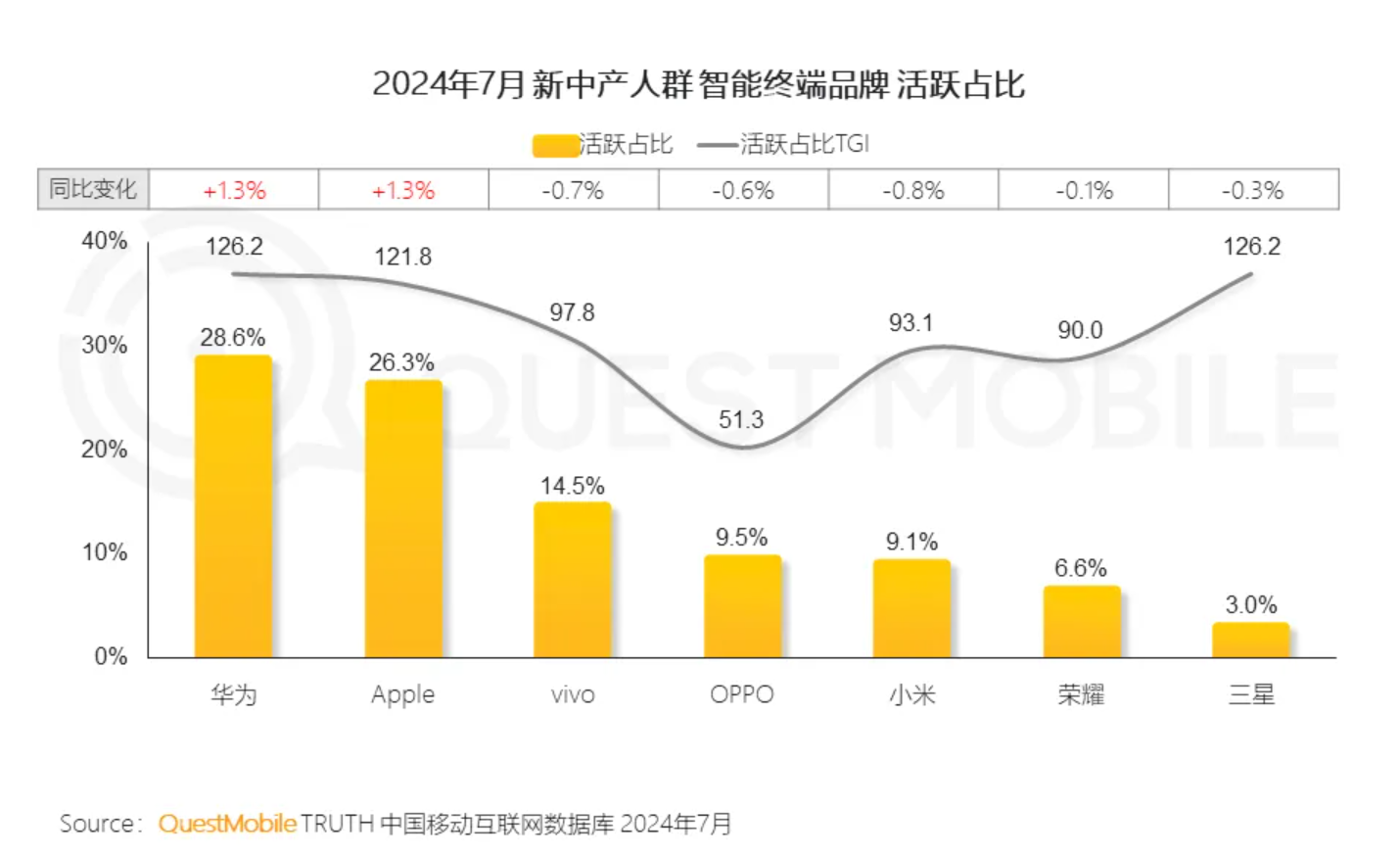 据QuestMobile的数据显示,新兴中产阶级在全网用户中的比例持续上升,到2024年7月,其规模已达到2.57亿,相比去年同期增长了4.8%。在智能手机的选择上,华为和苹果是新兴中产阶级的首选品牌,且使用率持续增长。具体来看,有28.6%的新兴中产阶级选择使用华为手机,位列第一;苹果以26.3%紧随其后,这两个品牌的活跃度同比均提升了13%。