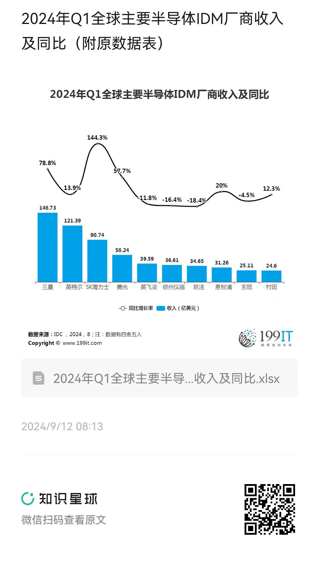 2024年Q1全球主要半导体IDM厂商收入及同比(附原数据表) ​​​