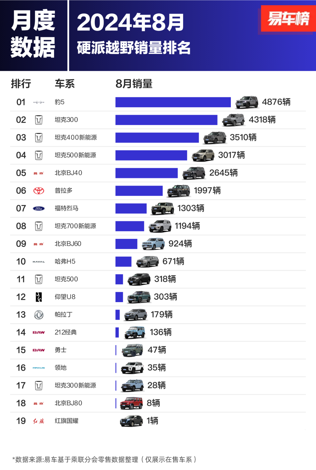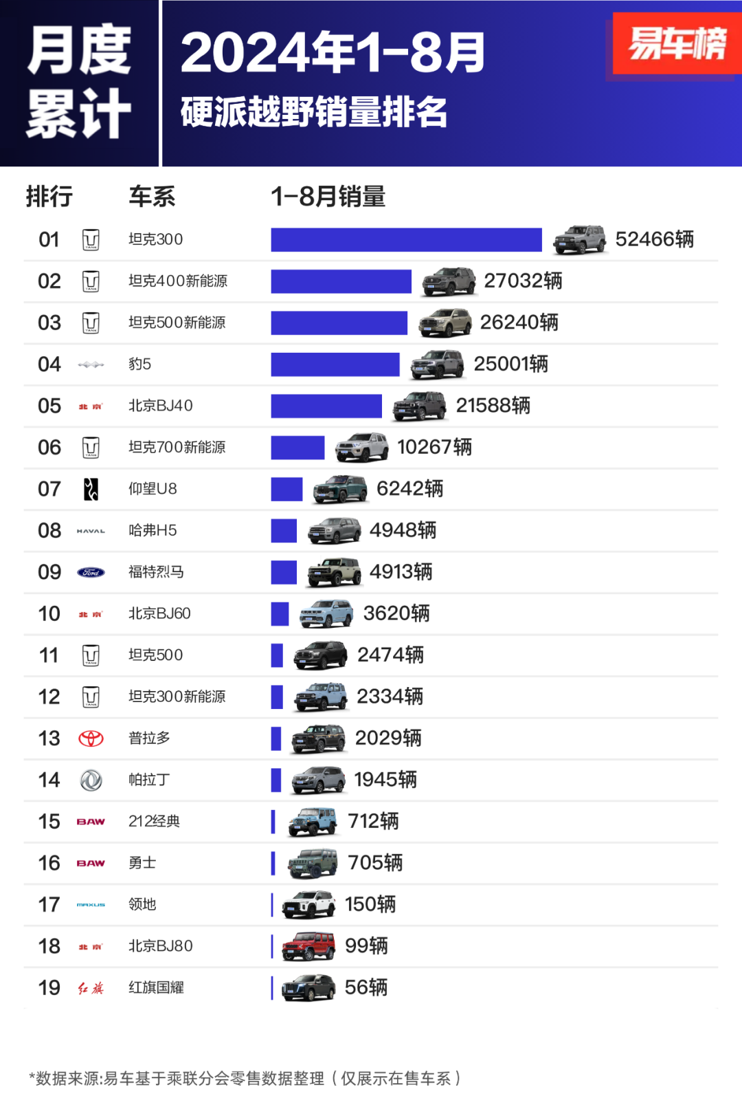 坦克300自从上市以来,引发了国内消费者对硬派越野的强烈兴趣,这些年新车不断,并且销量也有了非常明显的增长,近日,易车发布了今年1-8月和8月份硬派越野销量排行。长城汽车包揽了前三名,分别为坦克300、坦克400新能源和坦克500新能源,对应销量为52466辆、27032辆和26240辆,最热销的坦克300月均超6000辆,属实火爆。第四名来自首次进军硬派越野领域的比亚迪,也就是方程豹豹5,今年1-8月卖出了25001辆,表现相当可观,并且由于新款狂降5万,8月份豹5更是跻身当月销量第一名,后续增量或进一步提升。