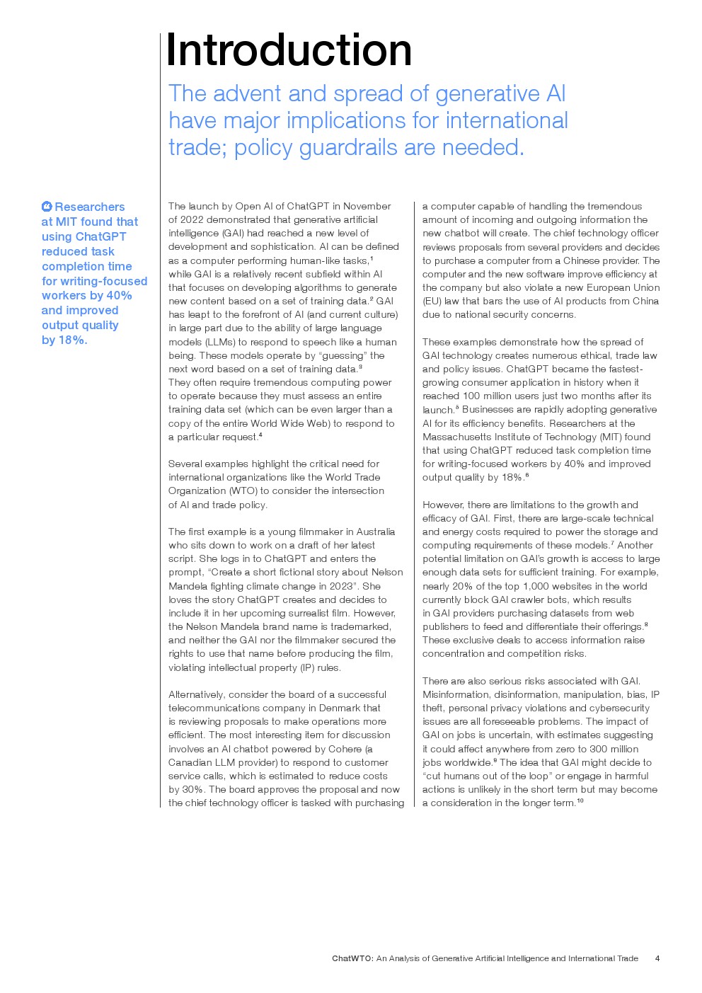 生成式人工智能(GAI)的快速发展将人工智能的发展和复杂程度推向了前所未有的水平。在大型语言模型(LLM)的推动下,它的迅速普及需要进行国际对话,以解决贸易政策领域的道德和政治挑战。