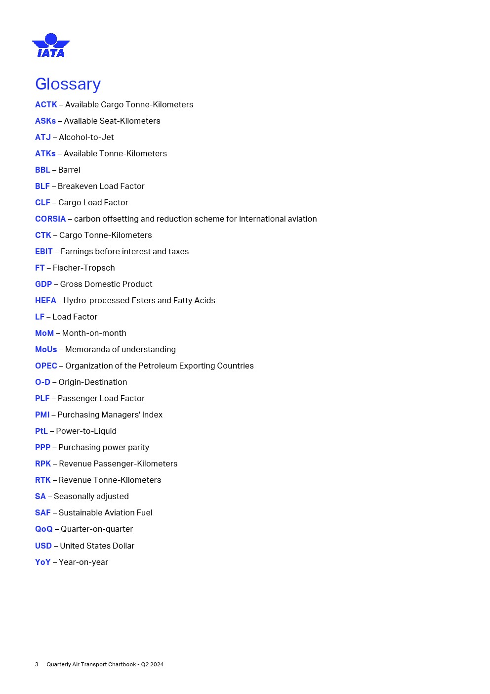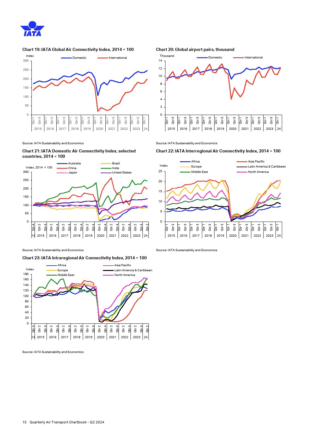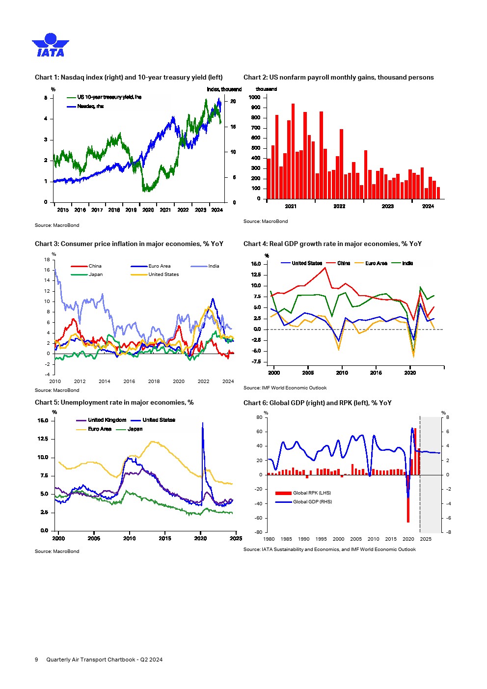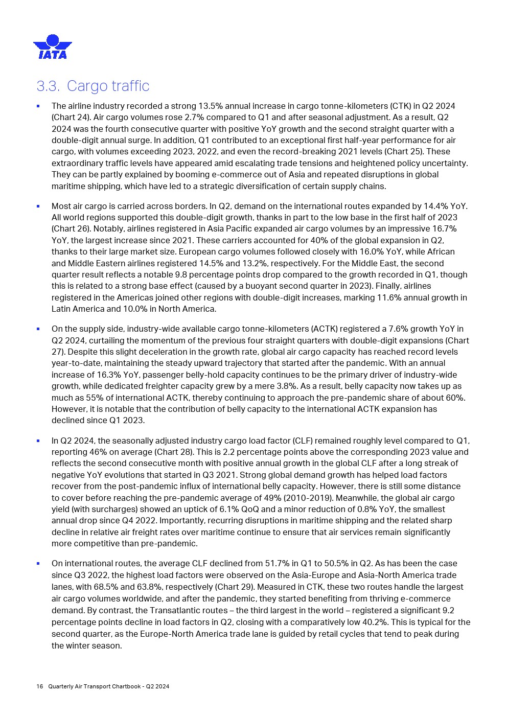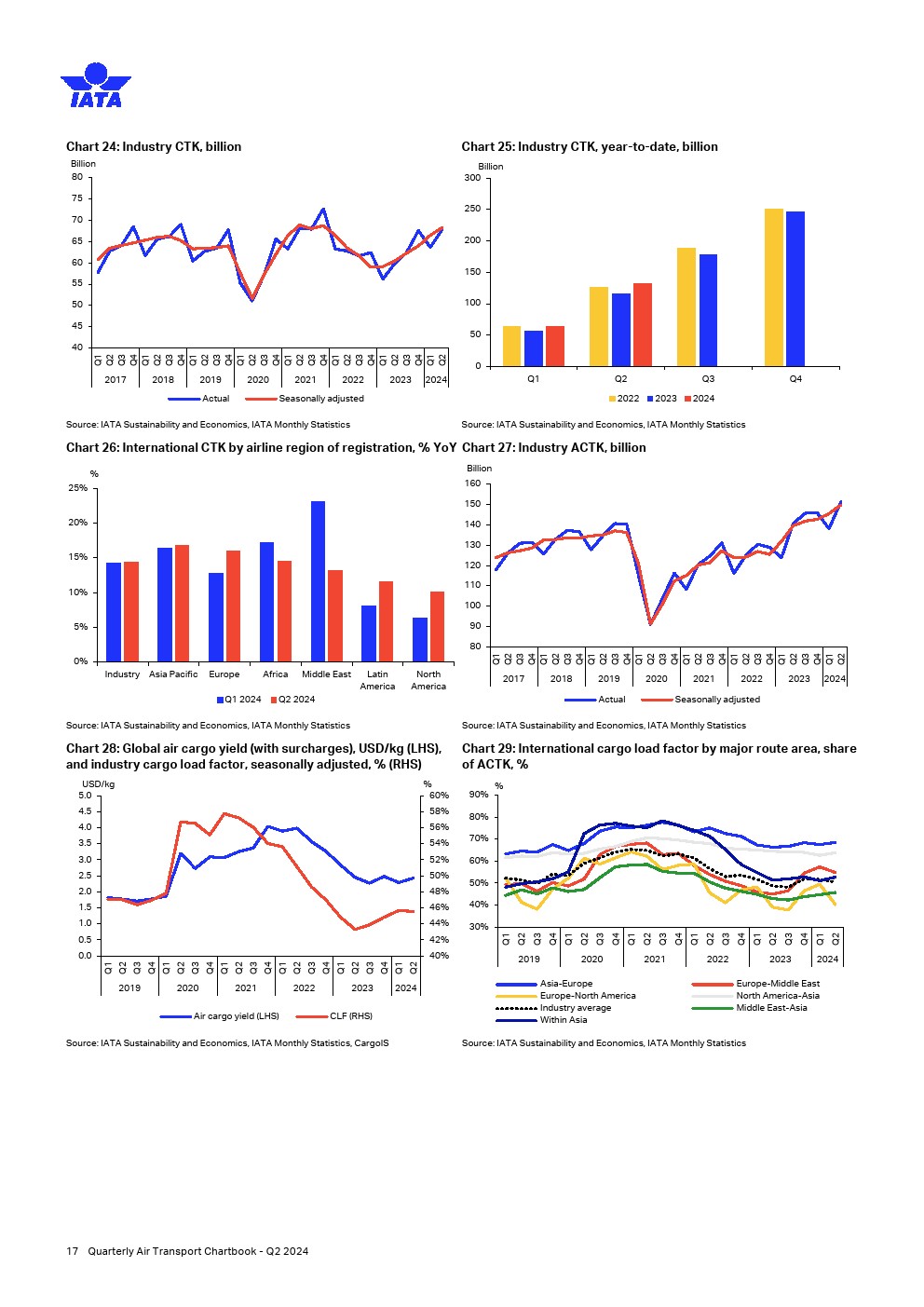2024年第二季度的航空货运吨公里(CTK)年增长率为13.5%。经季节性调整后,航空货运量较第一季度增长2.7%。在贸易紧张局势不断升级、政策不确定性加剧的背景下,出现了如此高的交通流量,部分原因是亚洲电子商务的蓬勃发展,以及全球海运的不断中断,这导致了某些供应链的战略多元化。