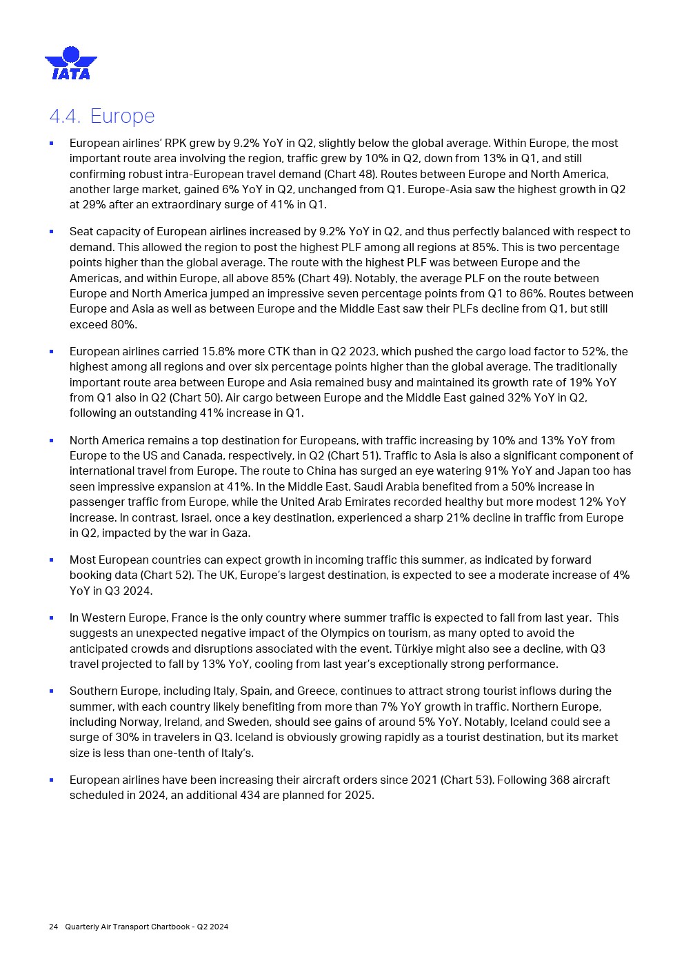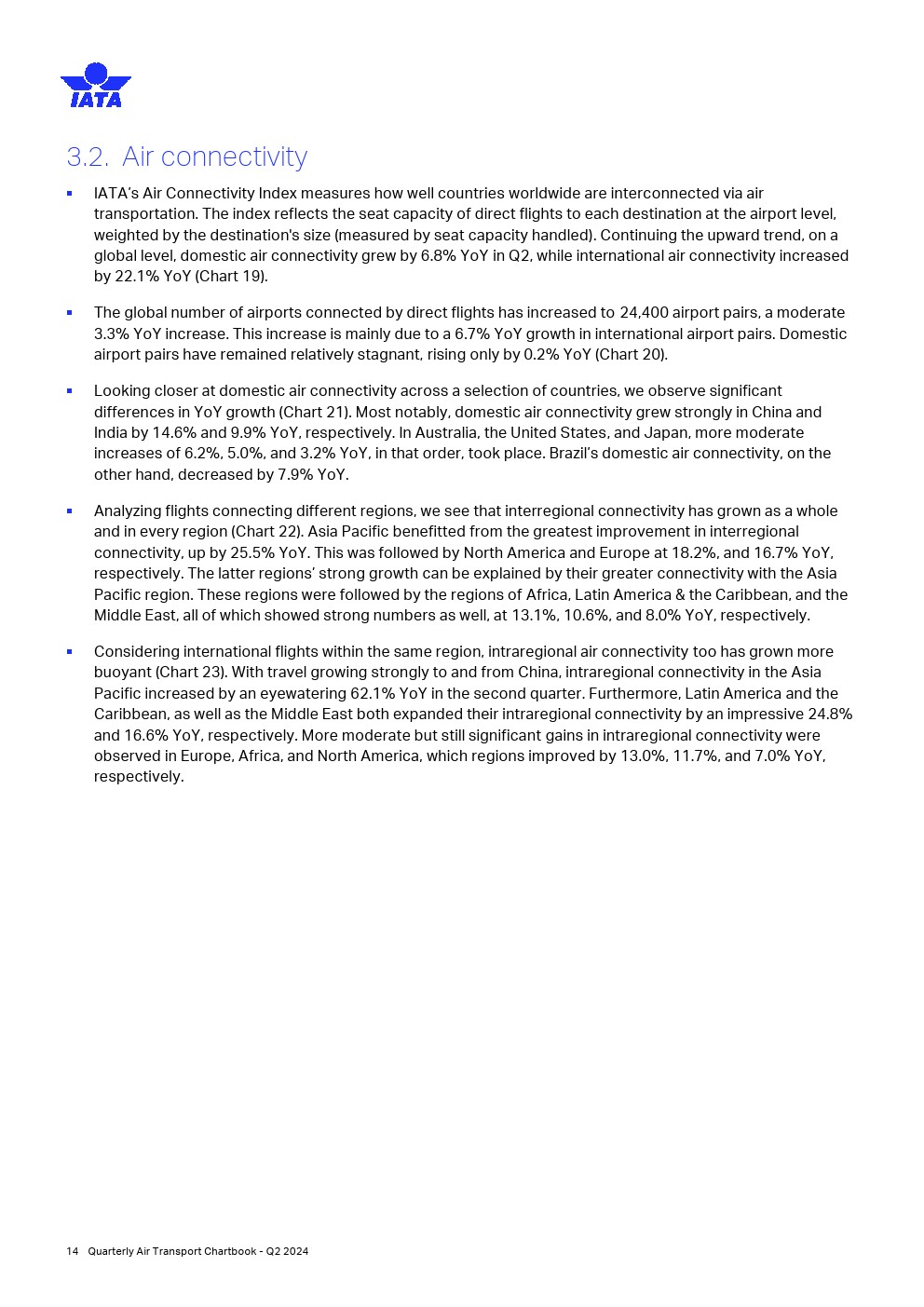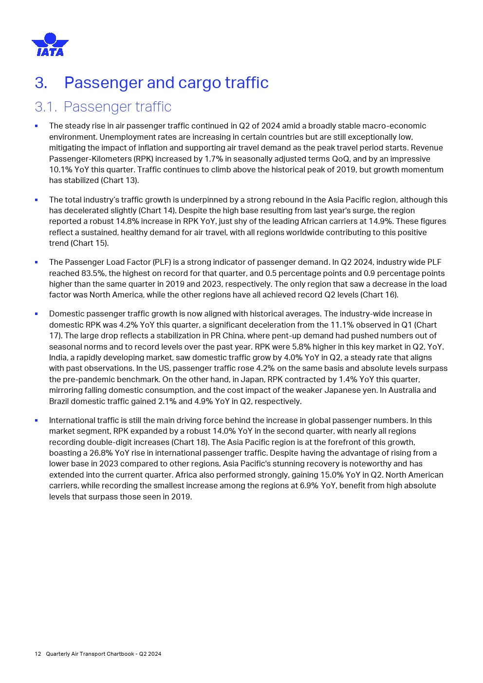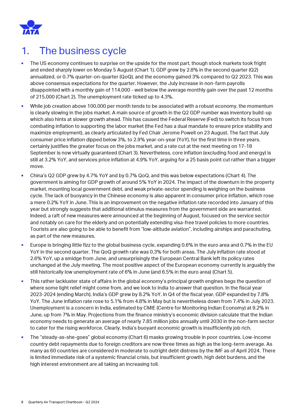 在宏观经济环境大体稳定的情况下,航空客运量在2024年第二季度继续稳步增长。某些国家的失业率正在上升,但仍处于非常低的水平,这减轻了通货膨胀的影响,并在旅游旺季开始之际支撑了航空旅行需求。经季节性因素调整后,客运公里数(RPK)环比增长1.7%,同比增长10.1%。流量继续攀升至2019年的历史峰值以上,但增长势头已经稳定下来。国内客运量增长与历史平均水平保持一致。本季度全行业国内RPK(收入客公里)同比增长4.2%,较第一季度的11.1%明显放缓。国际客运量RPK在第二季度同比增长了14.0%,几乎所有地区都实现了两位数的增长。