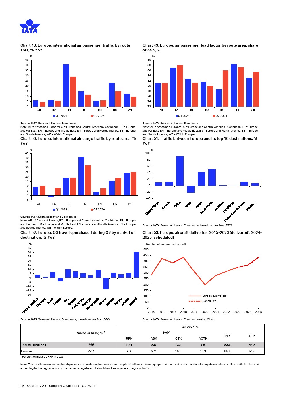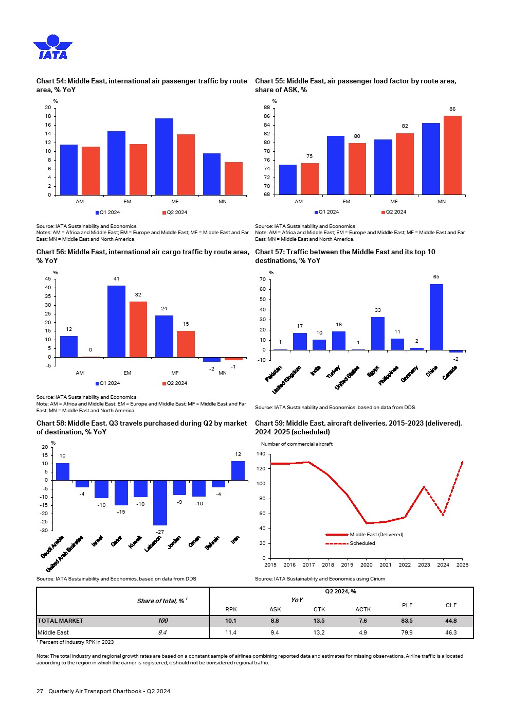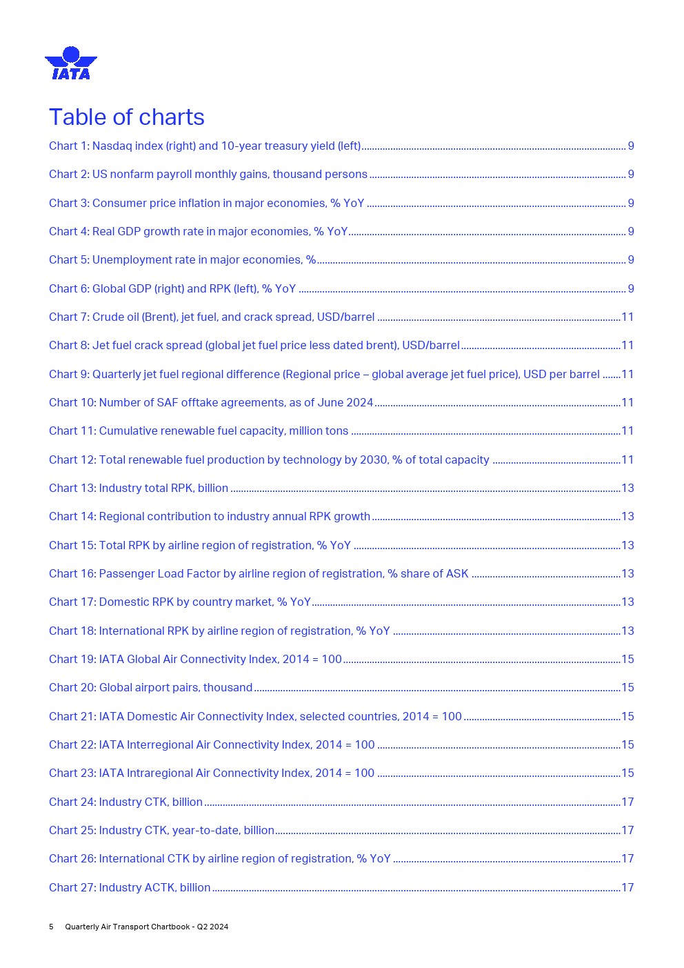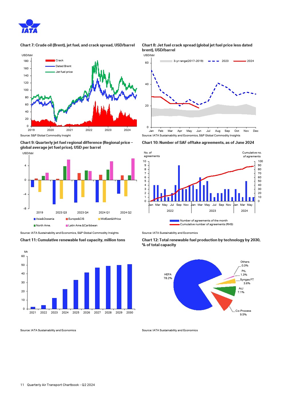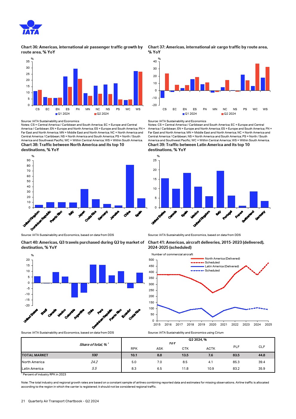 在宏观经济环境大体稳定的情况下,航空客运量在2024年第二季度继续稳步增长。某些国家的失业率正在上升,但仍处于非常低的水平,这减轻了通货膨胀的影响,并在旅游旺季开始之际支撑了航空旅行需求。经季节性因素调整后,客运公里数(RPK)环比增长1.7%,同比增长10.1%。流量继续攀升至2019年的历史峰值以上,但增长势头已经稳定下来。国内客运量增长与历史平均水平保持一致。本季度全行业国内RPK(收入客公里)同比增长4.2%,较第一季度的11.1%明显放缓。国际客运量RPK在第二季度同比增长了14.0%,几乎所有地区都实现了两位数的增长。