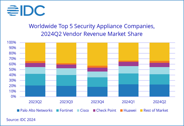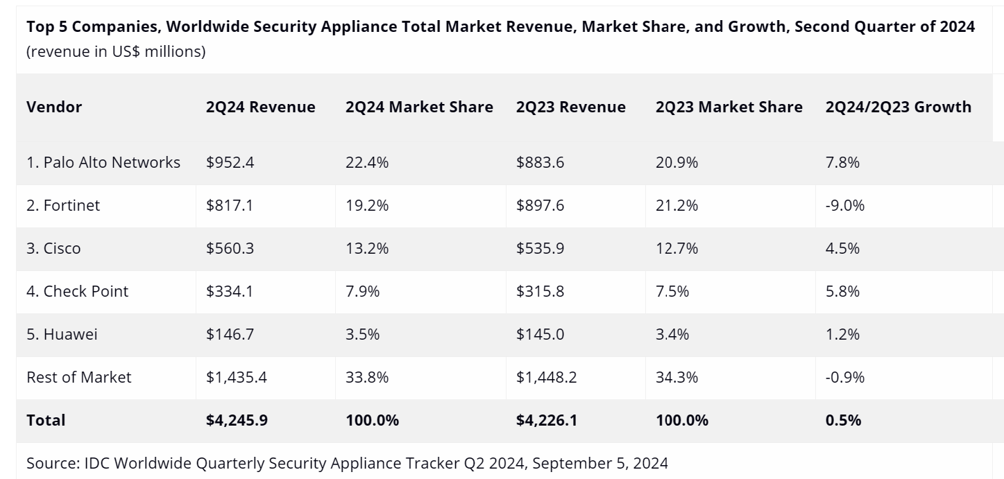 根据IDC的跟踪,全球安全设备市场总收入在2024年第二季度同比增长0.5%,达到42亿美元,与2023年第二季度相比增加了2000万美元。安全设备出货量在第二季度达到100万台,同比下降4.3%。
