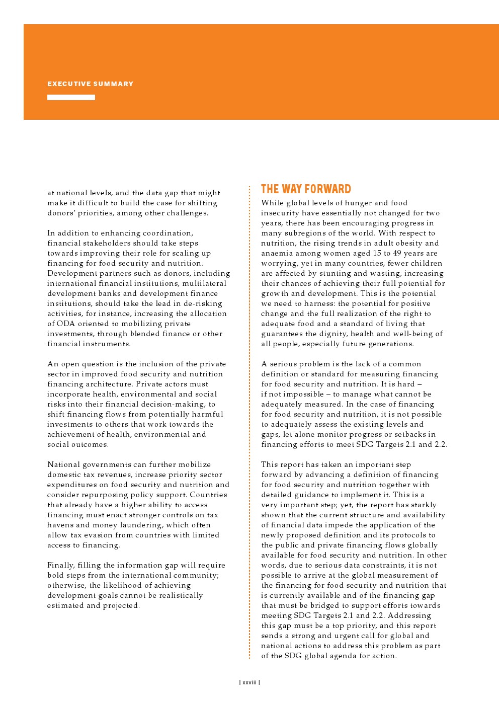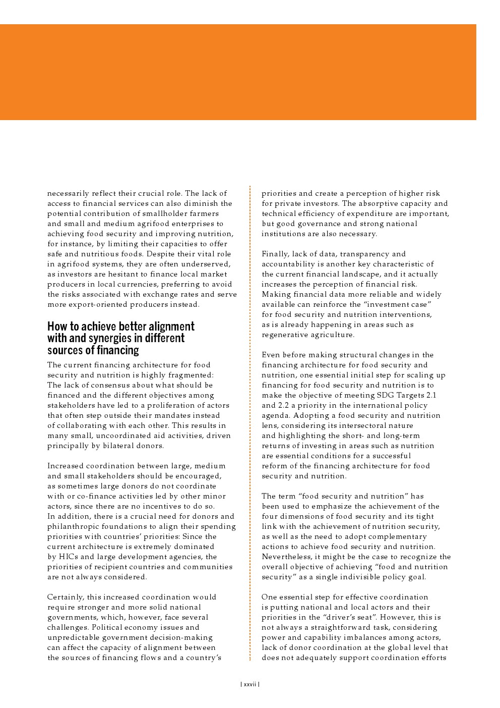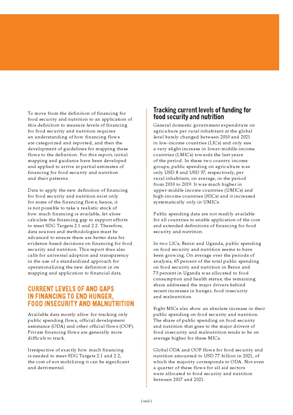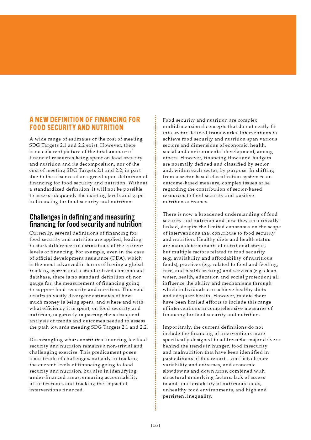 目前,对粮食安全和营养的供资采用了几种定义,导致对目前供资水平的估计存在明显差异。这一空白导致在粮食安全和营养方面花费了多少资金、在何处以及以何种效率花费资金的估计存在巨大差异,从而对评估实现可持续发展目标2.1和2.2的路径所需的趋势和结果的后续分析产生了负面影响。