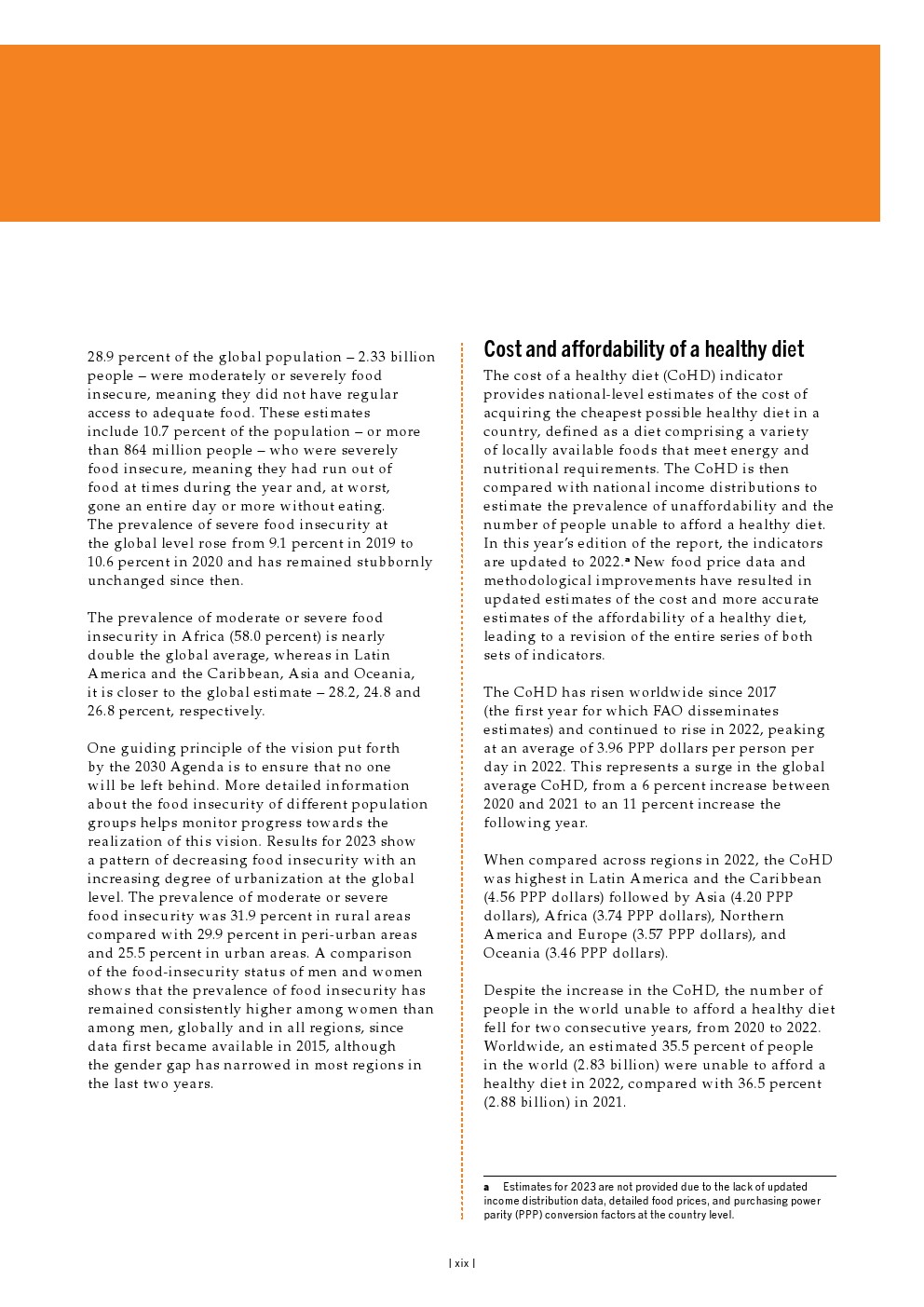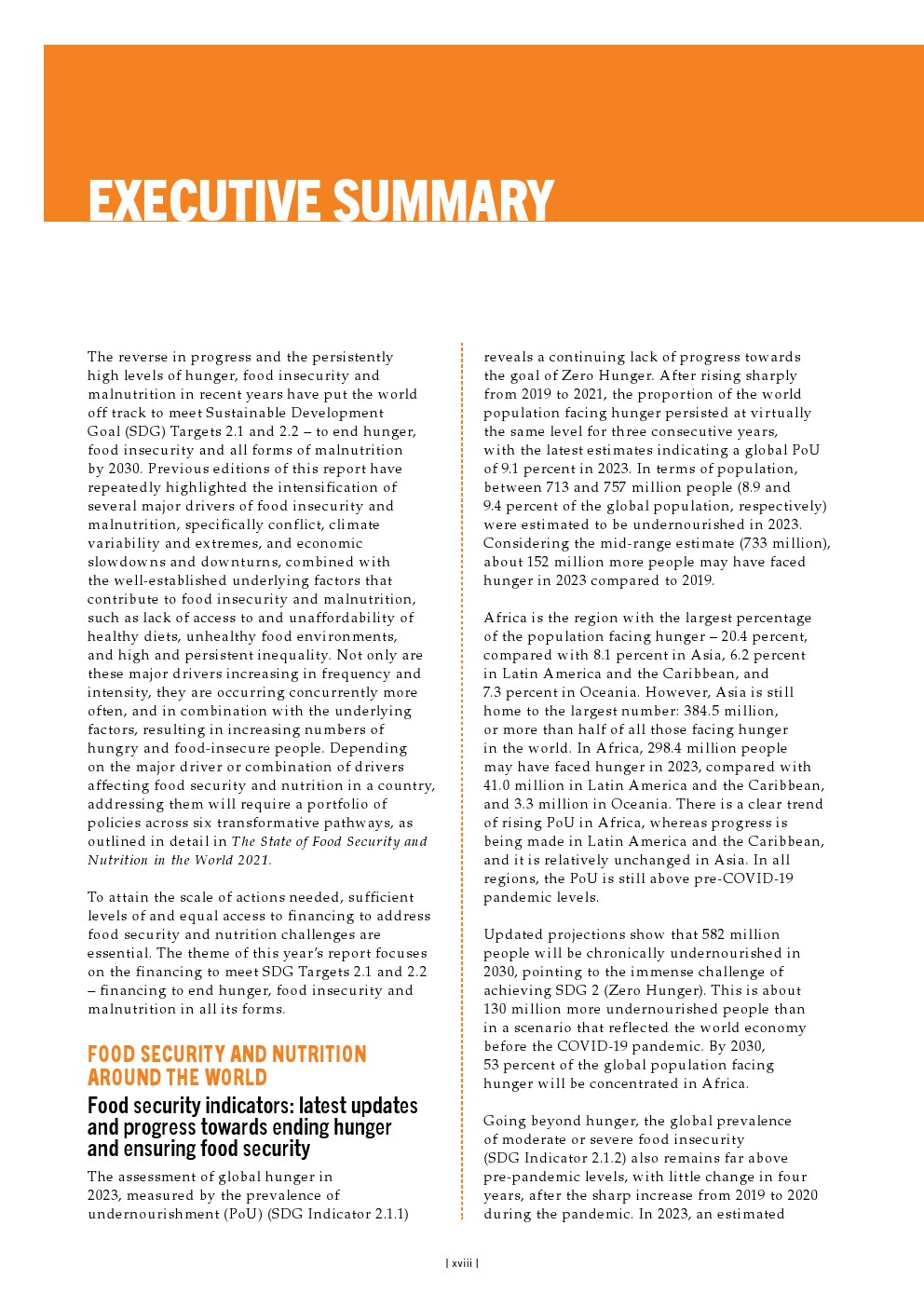 以食物不足发生率(可持续发展目标指标2.1.1)衡量的2023年全球饥饿评估显示,在实现零饥饿目标方面仍然缺乏进展。在经历了2019-2021年的大幅上升之后,世界饥饿人口比例连续三年几乎保持在同一水平。最新估计显示,2023年全球饥饿人口比例将达到9.1%。就人口而言,2023年估计有7.13亿至7.57亿人(占全球人口的8.9%和9.4%)营养不良。