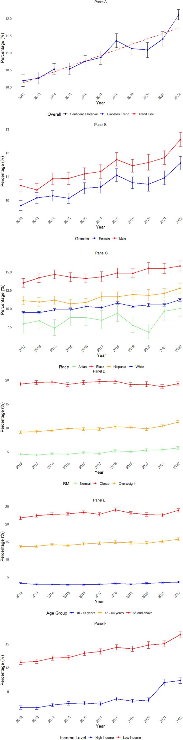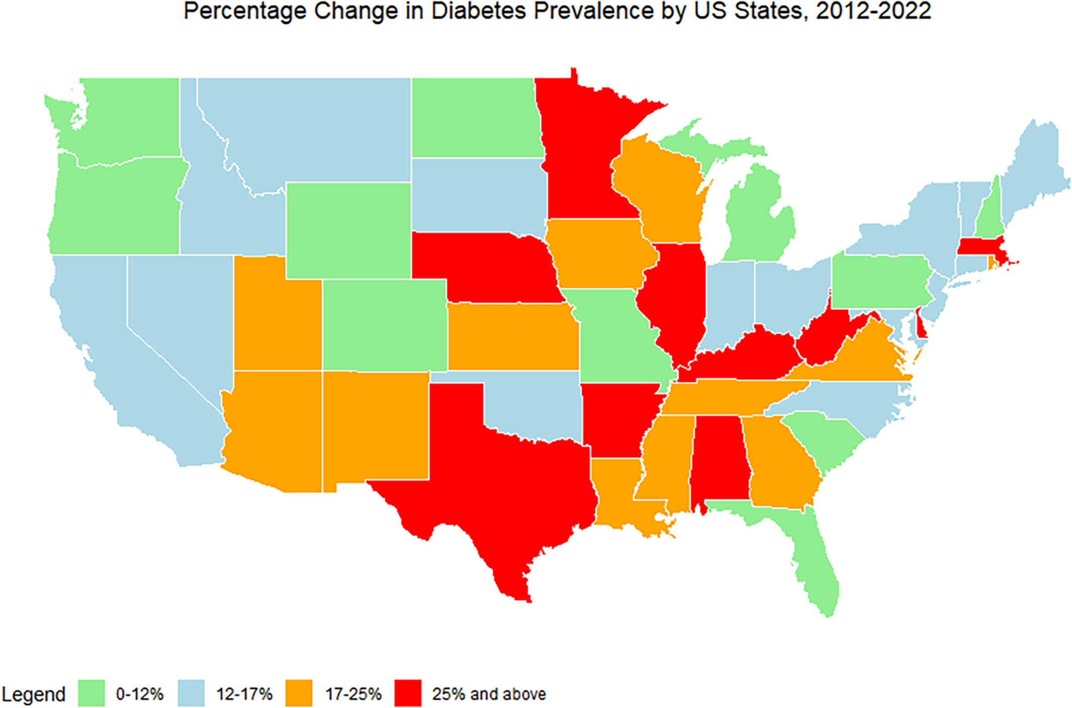 该论文强调了 2 型糖尿病造成的经济负担,以及在与本论文相同的研究期间,该病的发病率有所上升。除其他风险因素外,研究人员还发现了糖尿病发病率的地区差异。尤其是南部和中西部地区,2 型糖尿病患者人数大幅增加,其中阿肯色州、肯塔基州和内布拉斯加州在 2012 年至 2022 年期间的增幅最大。