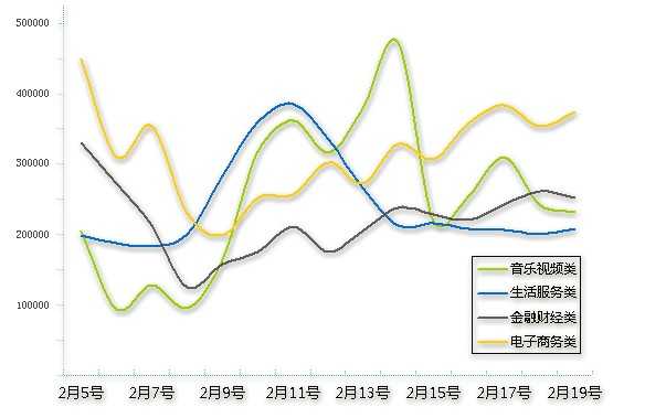 春节期间,JiaThis针对9000多万用户的分享行为,抽样分析了四种垂直类型媒体(生活服务类、视频类、金融财经类、电子商务类)的分享数据。绘制出这几类垂直媒体在春节期间的变化趋势,如下图。