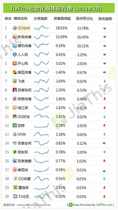 附:Jiathis.com公司数据来源说明:JiaThis是一家“社会化分享”聚合按钮提供商,为80万多家网站提供“收藏&分享”按钮服务,这个聚合按钮上整合了如:QQ、新浪微博、开心网、人人网…等120多个社会化“收藏&分享”按钮。 JiaThis通过2013年2月份分享数据,对将近9000多万用户对各种分享按钮的使用次数,进行综合分析统计,得出了以上数据报表。