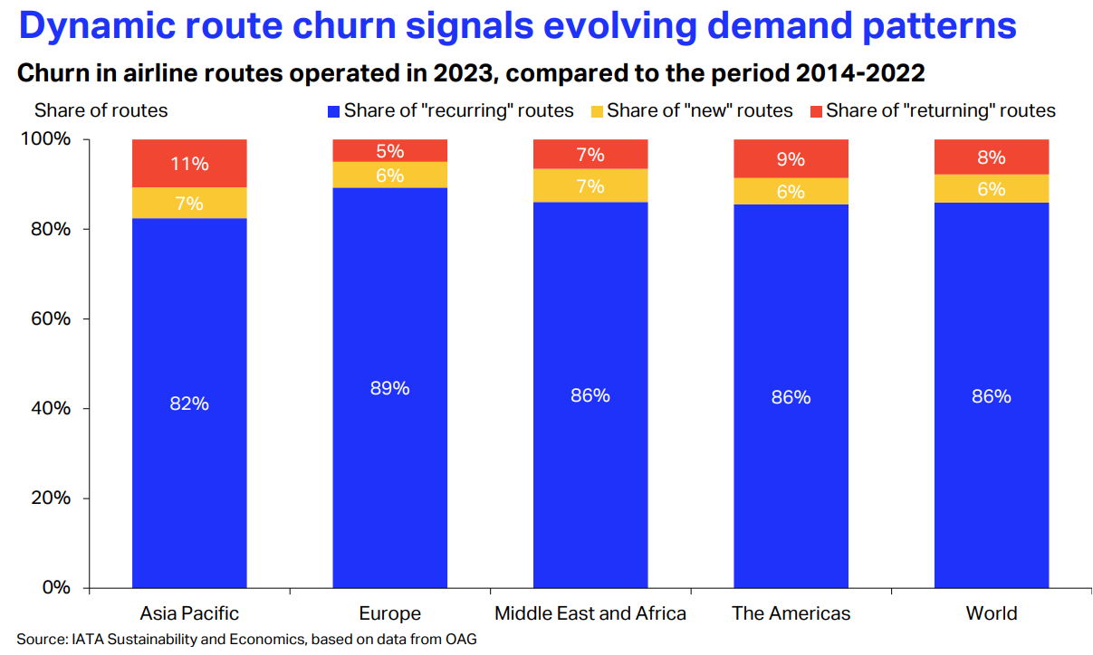 变动最大的是亚太地区,2023年只有82%的航线结构与2022年相同。不出所料,鉴于中国后来重新开放了国际航空运输市场,该地区在2023年的恢复航线中所占份额最高,为11%。这并没有阻止该地区开辟7%的独特新航线,这一壮举只有中东和非洲能与之匹敌。