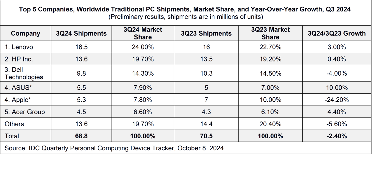 根据国际数据公司IDC最新一期《全球季度个人计算设备跟踪》,2024年第三季度全球传统PC出货量同比下降2.4%,达到6880万台。这一结果也是由于成本上升和库存补充等因素影响,由于上一季度出货量激增,导致这一季度略微放缓。