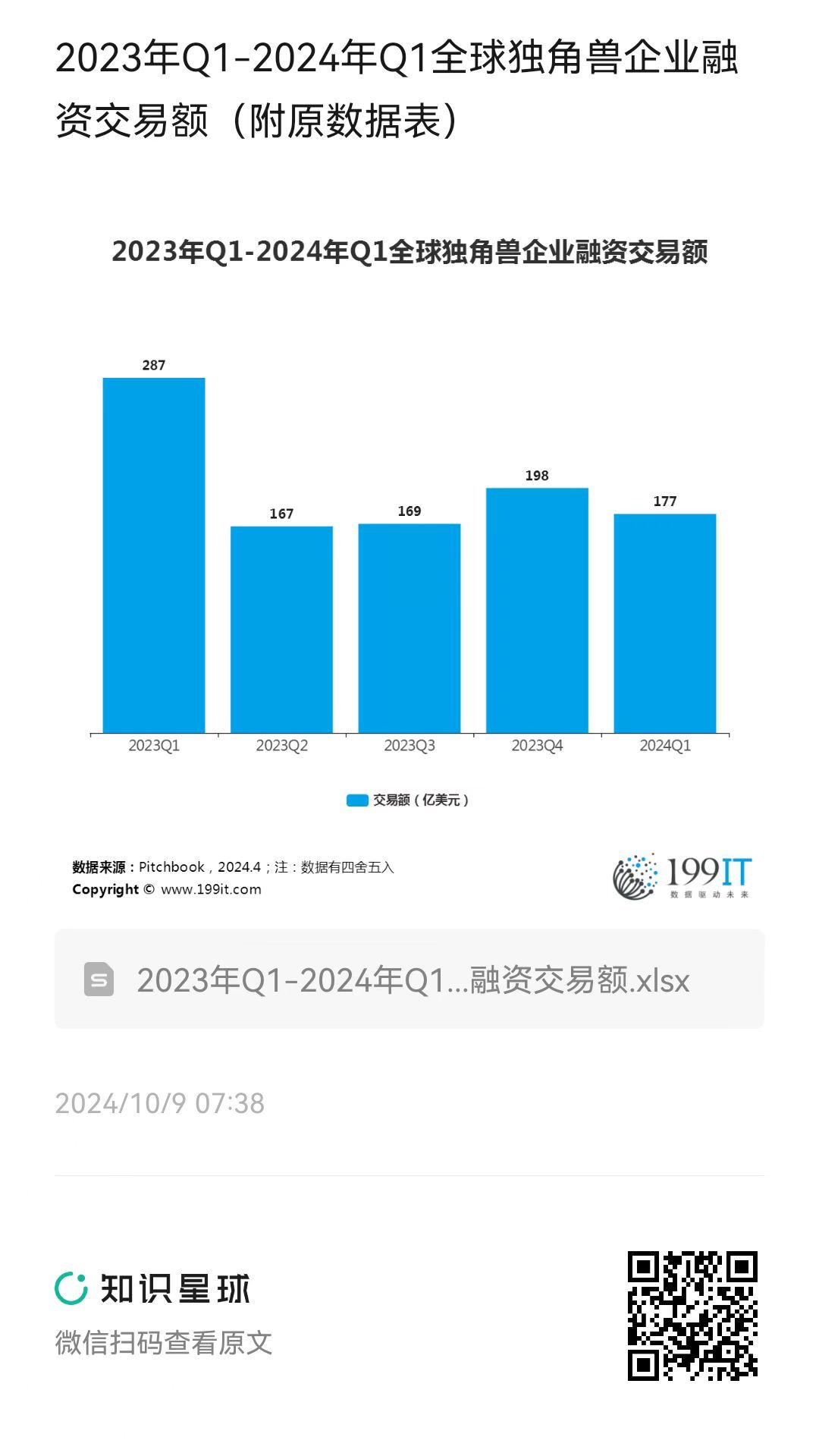 2023年Q1-2024年Q1全球独角兽企业融资交易额(附原数据表) ​​​