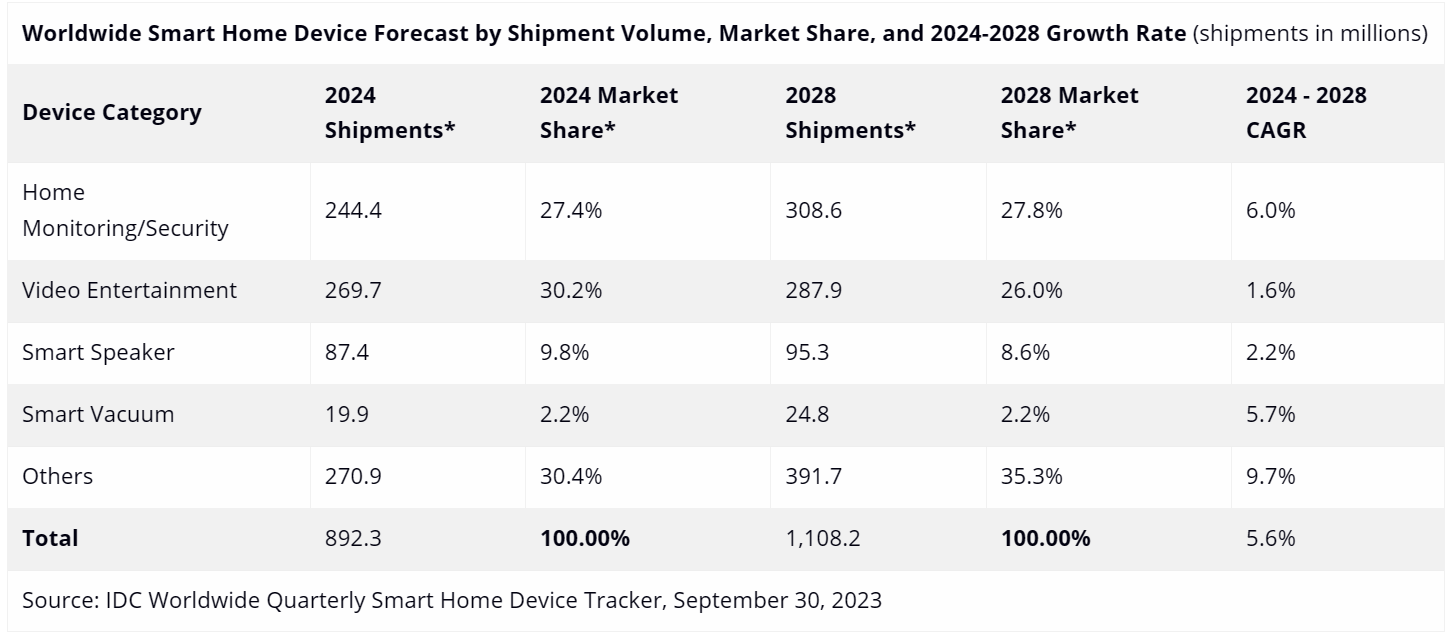 展望未来,IDC估计,2024年至2028年间,智能家居市场的复合年增长率(CAGR)将达到5.6%,最后一年的出货量将达到11亿台。新兴市场、人工智能的持续普及,以及电视等成熟品类的更新周期,预计将推动这一增长。