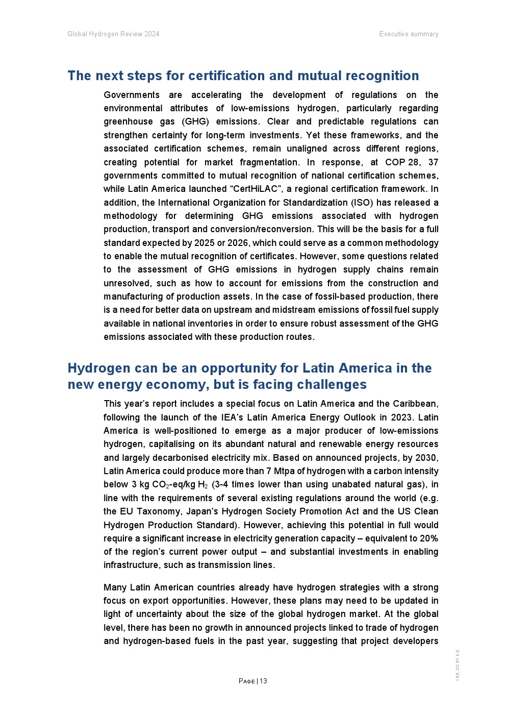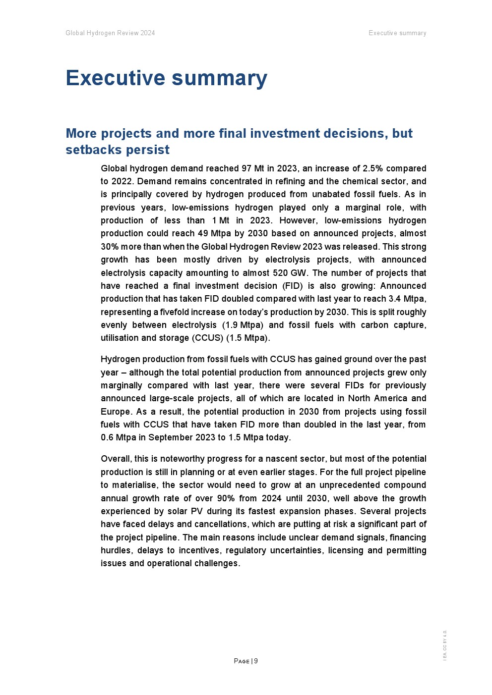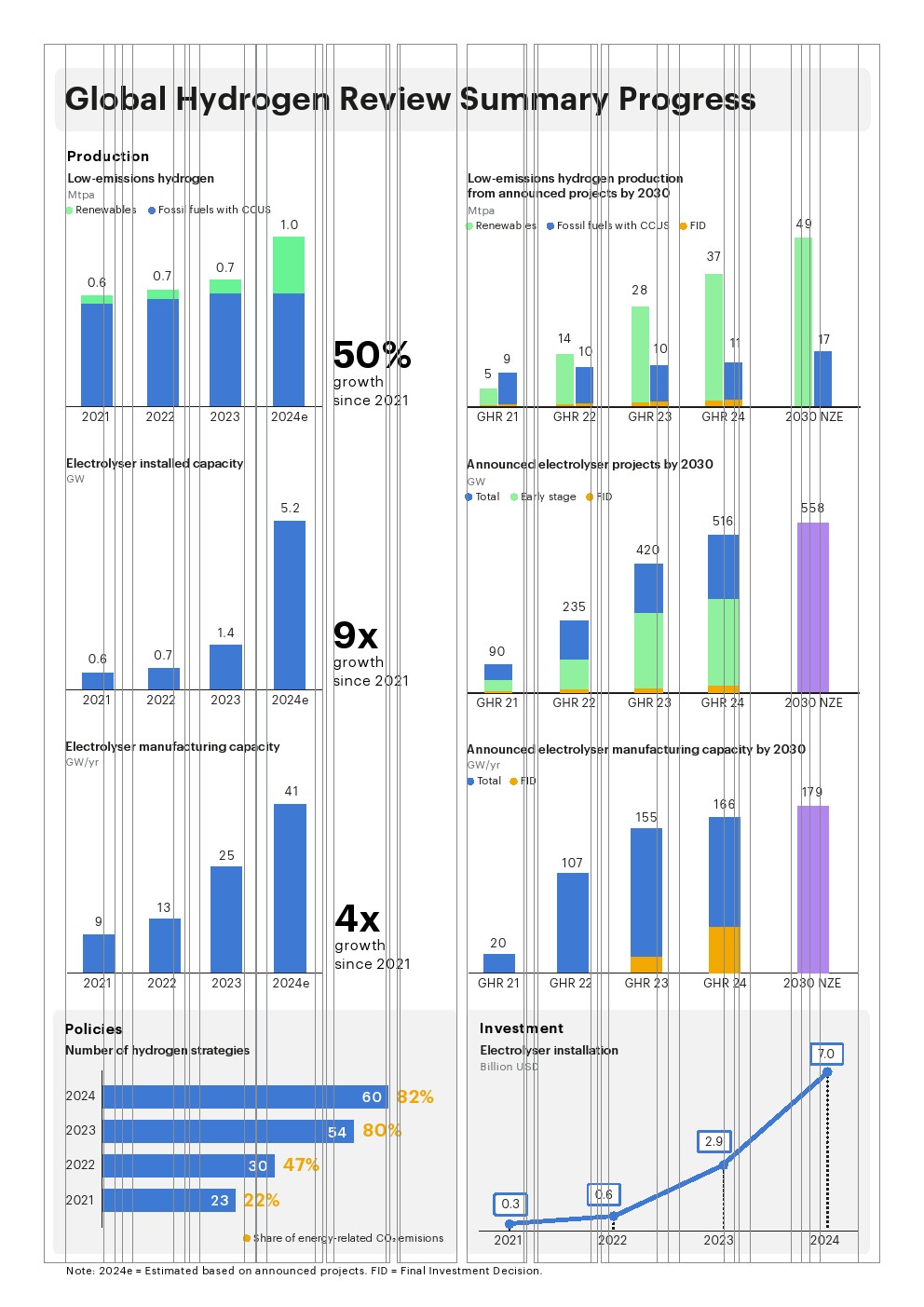 IEA发布了“2024年全球氢评价”,跟踪了全球氢气生产和需求,以及基础设施发展、贸易、政策、法规、投资和创新等关键领域的进展。