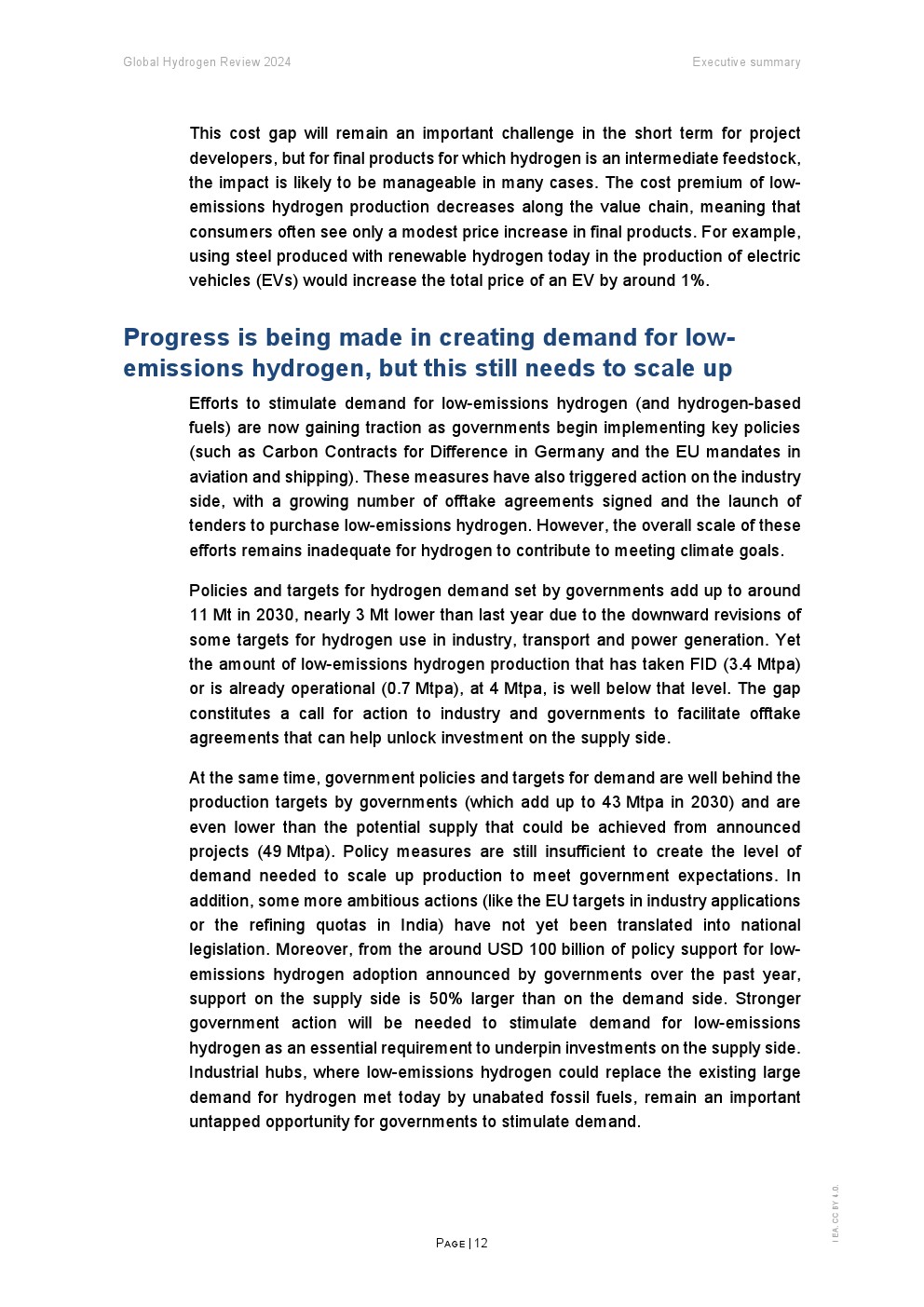 在创造对低排放氢的需求方面正在取得进展,但这仍需要扩大规模