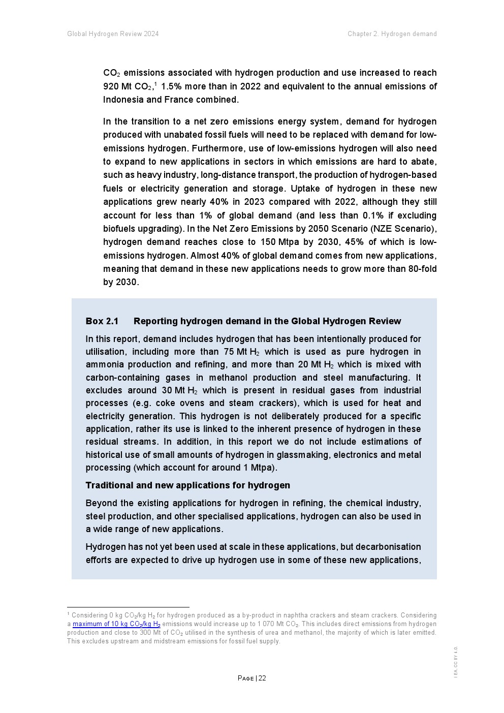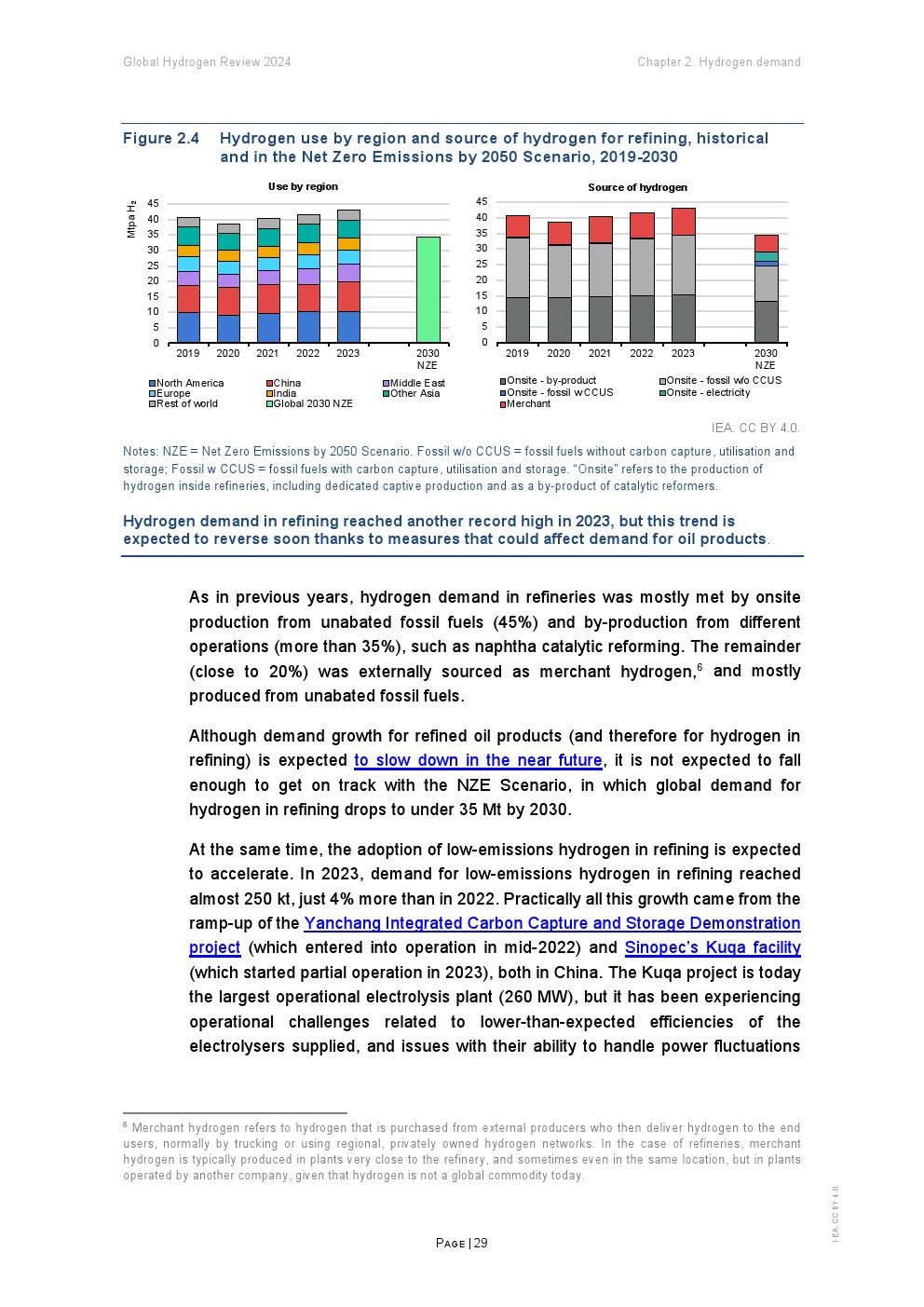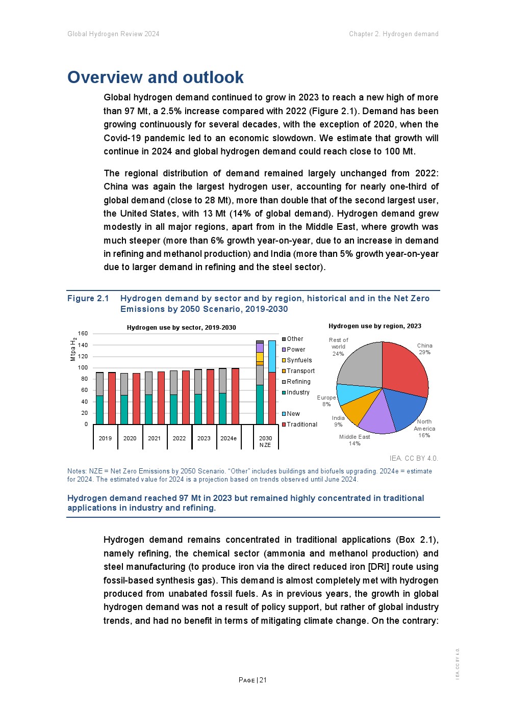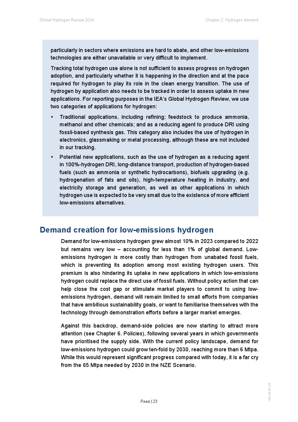 2023年全球氢需求达到9700万吨,比2022年增长2.5%。需求仍然集中在炼油和化工部门,主要由未减氢的化石燃料生产的氢来满足。与前几年一样,低排放的氢气只发挥了边际作用,2023年的产量不到100万吨。