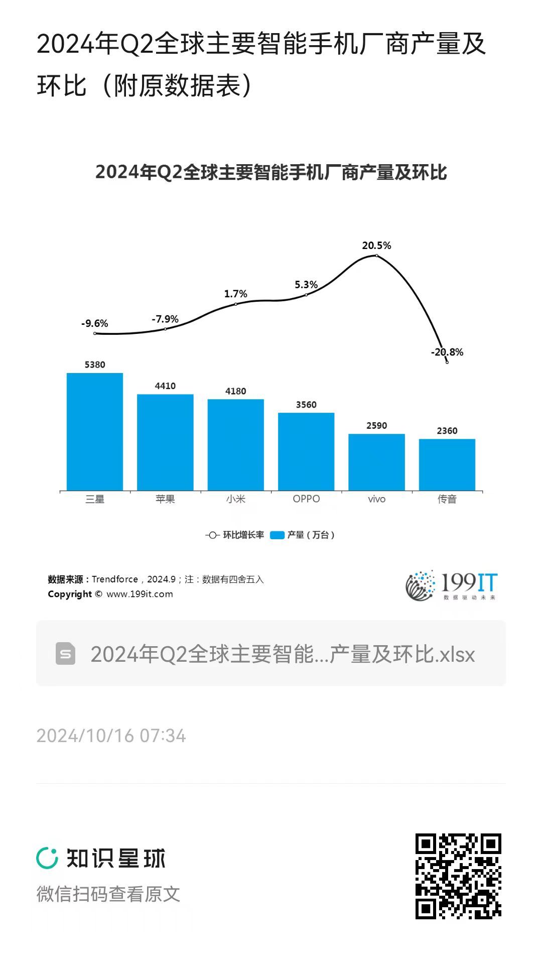 - 2024年Q2全球主要智能手机厂商产量市场份额(附原数据表)