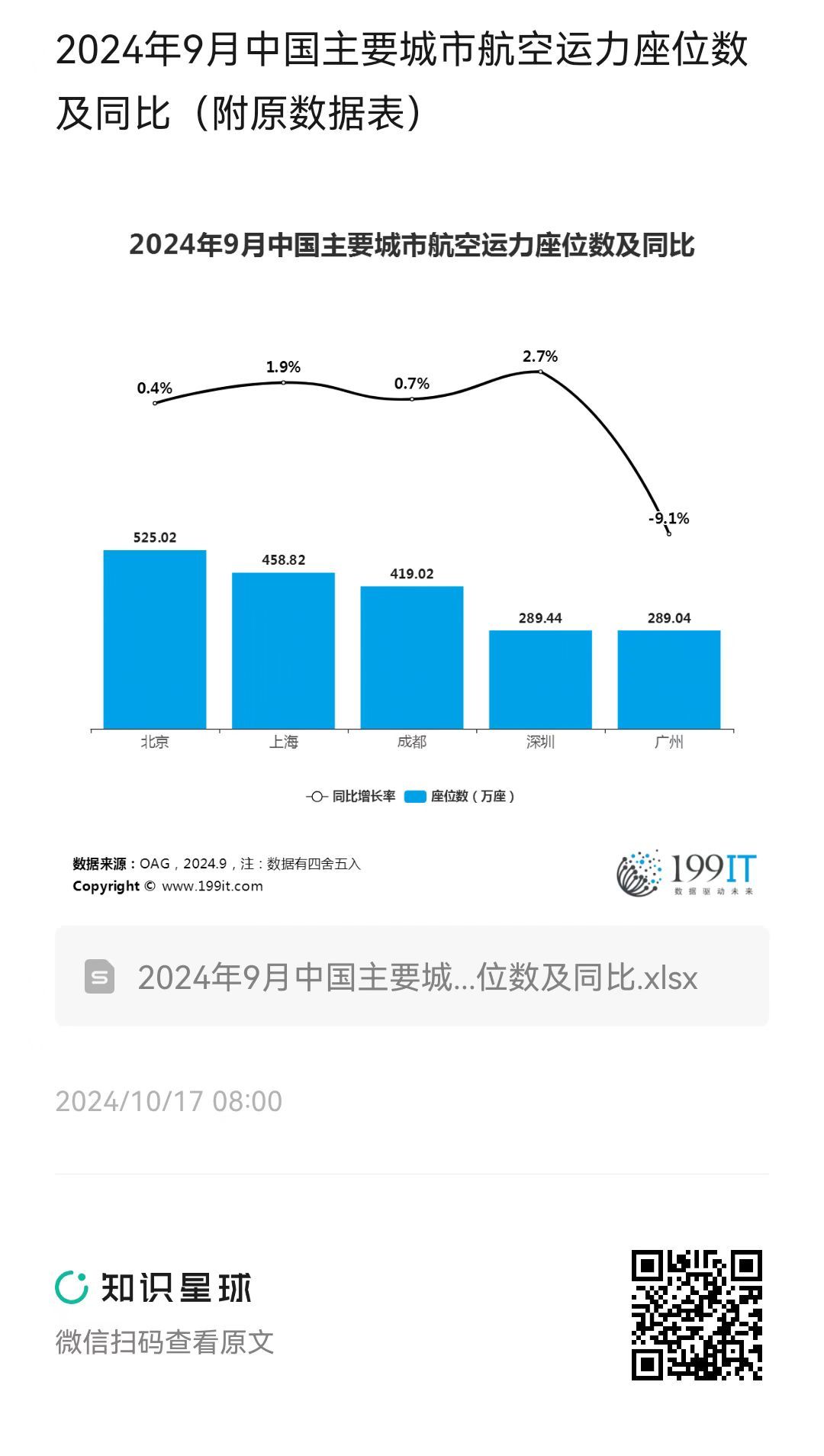 - 2024年10月中国主要城市航空运力座位数及同比(附原数据表)