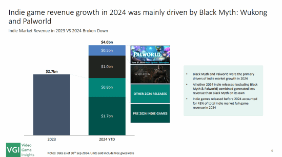 今年令人瞩目的增长主要得益于《黑神话:悟空》和《幻兽帕鲁》等作品,VG Insights将这些游戏归类为独立游戏。