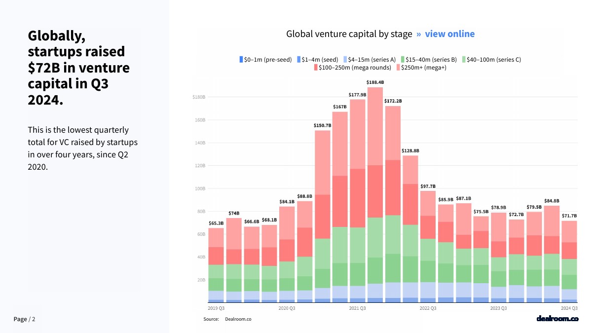 在全球范围内,创业公司在2024年第三季度筹集了720亿美元的风险资本。这是自2020年第二季度以来初创公司获得风投总额最低的一个季度。