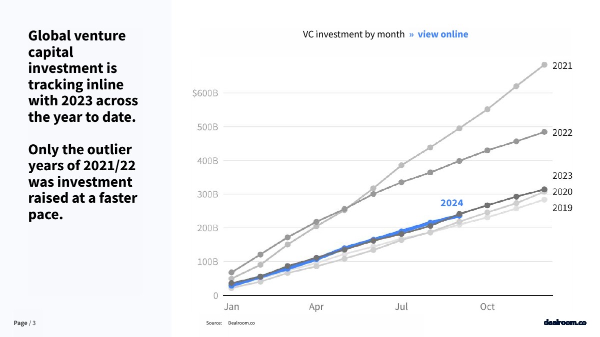 到目前为止,全球风险投资与2023年保持一致。只有2021/22年的异常年份投资增长速度更快。