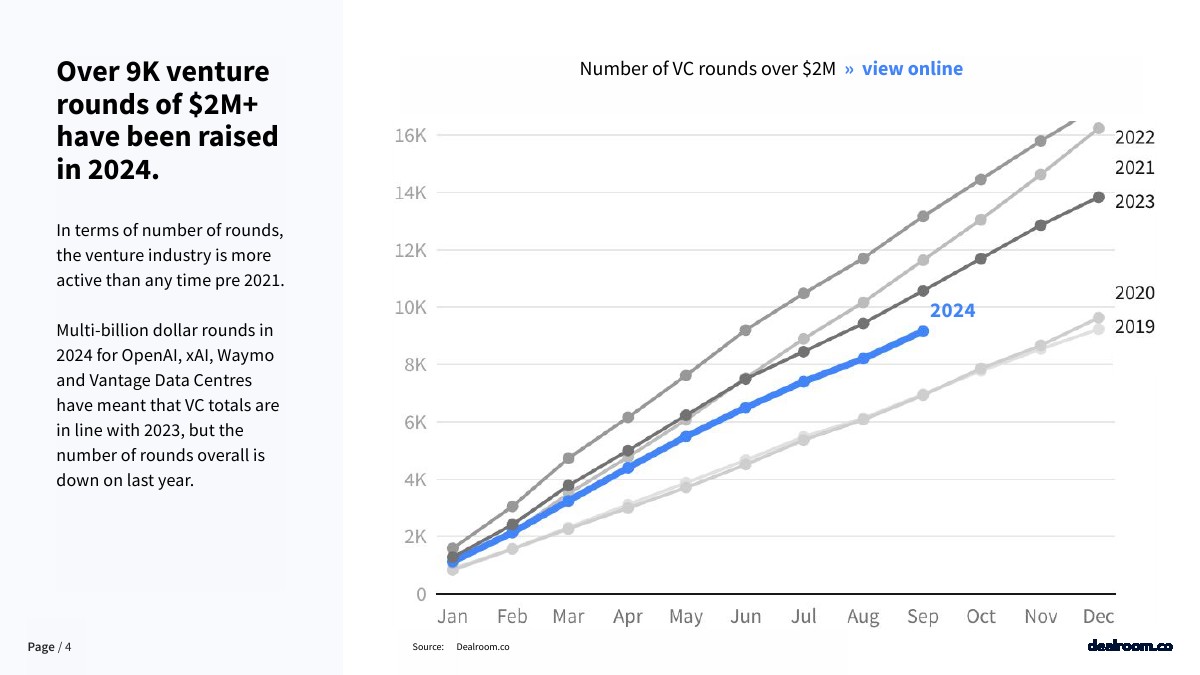 2024年,已经有超过9000笔200万美元以上的风险投资。就交易数而言,风险投资行业比2021年之前的任何时候都要活跃。2024年,OpenAI、xAI、Waymo和Vantage数据中心获得了数十亿美元的融资,这意味着风险投资总额与2023年持平,但总体融资轮数比去年有所下降。