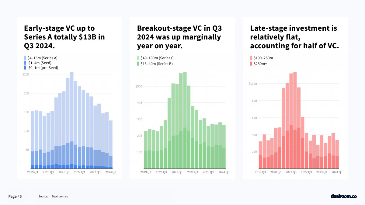 2024年第三季度,A轮的风险投资总额为130亿美元。2024年第三季度成长型风险投资同比略有增长。后期投资相对平缓,占VC的一半。