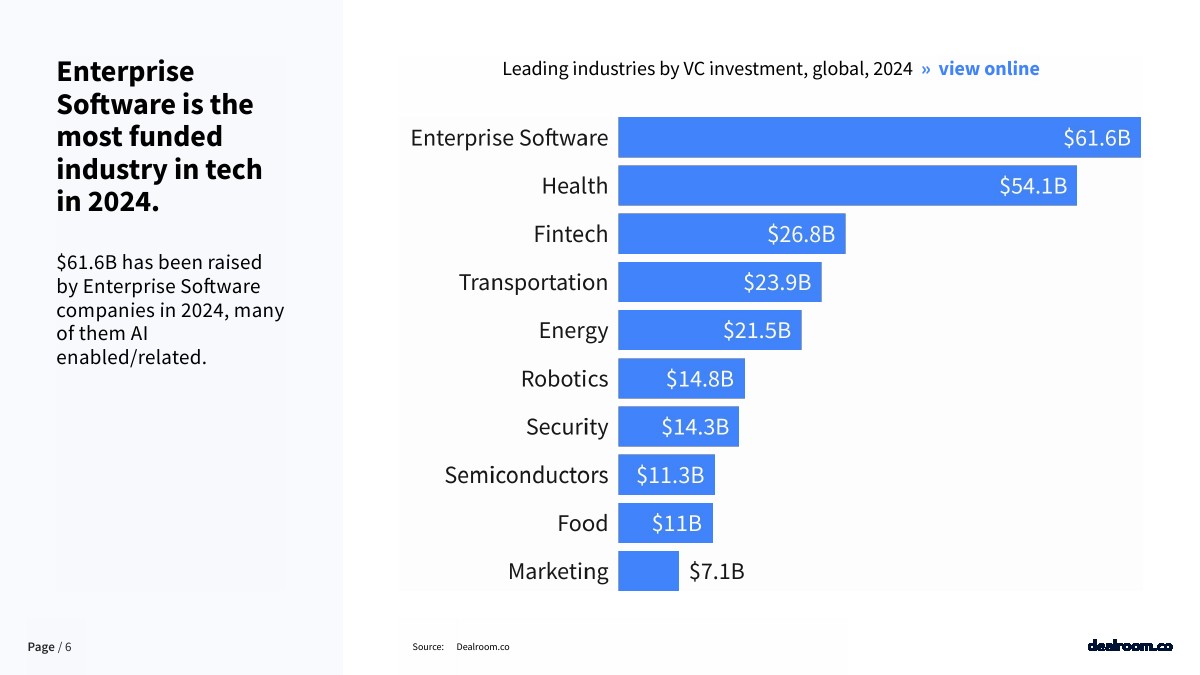 2024年,企业软件是科技行业融资最多的分支。企业软件公司在2024年获得了616亿美元投资,其中许多公司都支持人工智能/与人工智能相关。