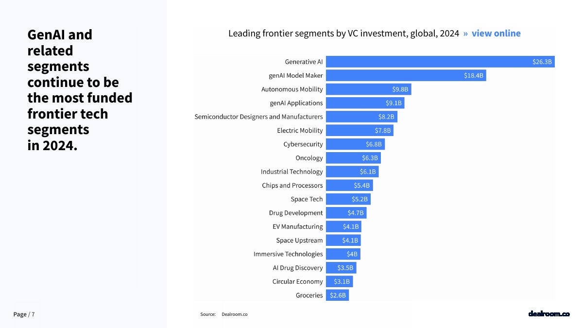 2024年,GenAI及相关领域继续成为融资最多的前沿技术。
