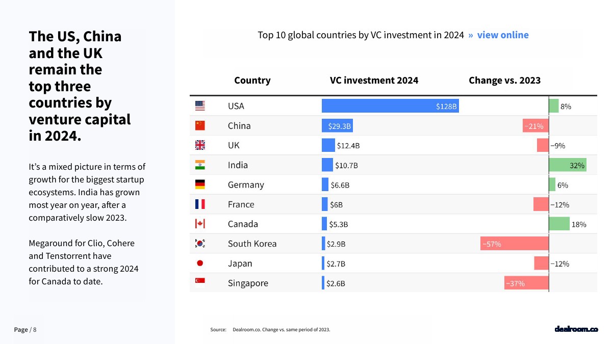 2024年,美国、中国和英国仍是风险投资规模最大的三个国家。就最大的创业生态系统的增长而言,情况喜忧参半。在经历了相对缓慢的2023年之后,印度的同比增长最快。到目前为止,Clio、Cohere和Tenstorrent的巨轮投资为加拿大2024年的强劲表现做出了贡献。