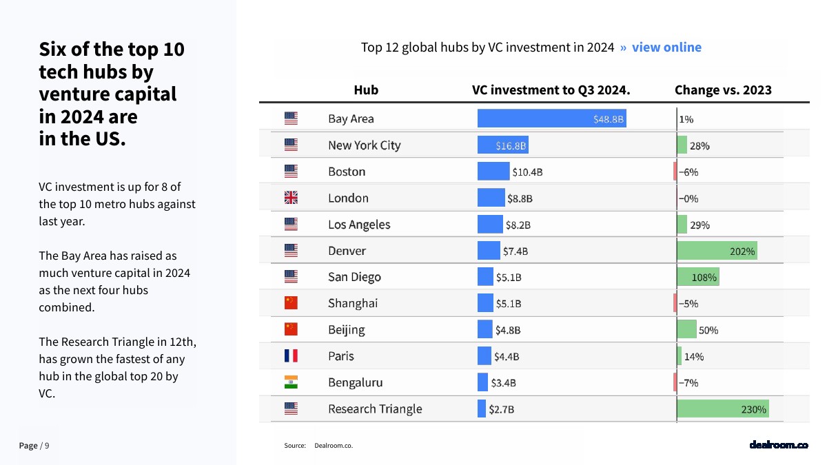 2024年风险资本排名前10的科技中心有6个在美国。与去年相比,10大城市中心有8个的风险投资有所增加。湾区在2024年获得的风险投资相当于后面四个中心的总和。三角研究中心(Research Triangle)排名第12位,是全球风投中心20强中增长最快的。