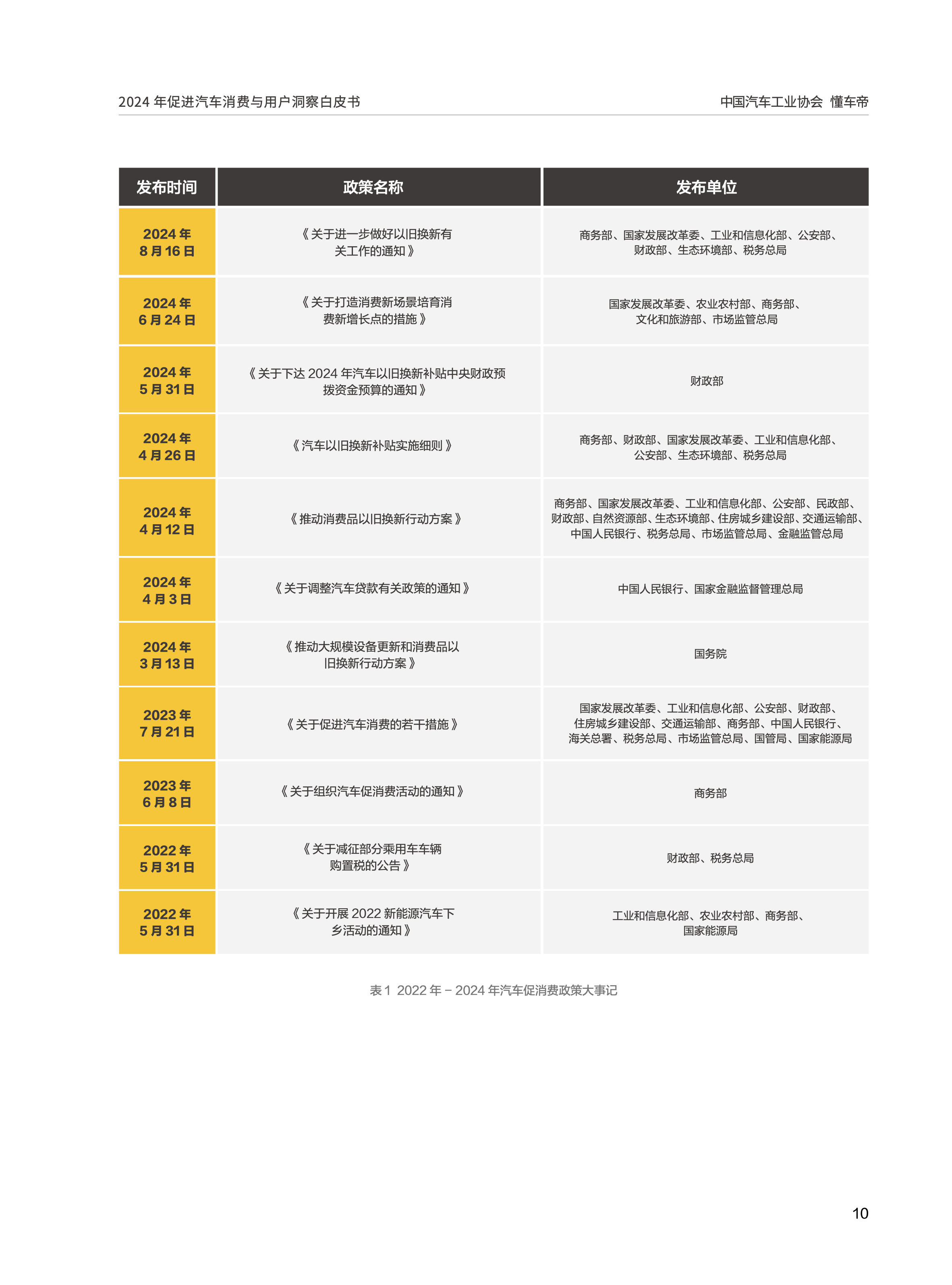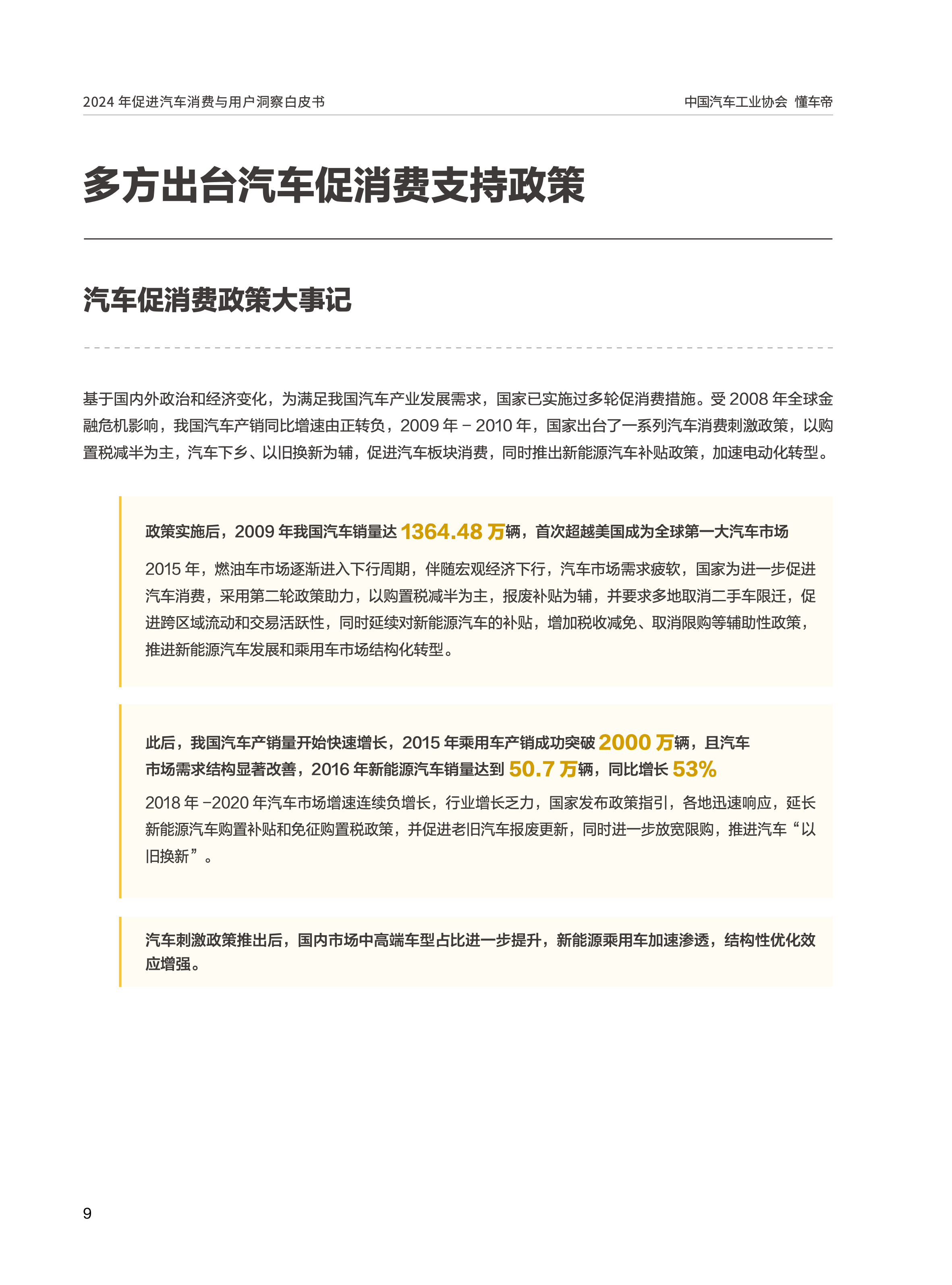 基于国内外政治和经济变化,为满足我国汽车产业发展需求,国家已实施过多轮促消费措施。受 2008 年全球金 融危机影响,我国汽车产销同比增速由正转负,2009 年 – 2010 年,国家出台了一系列汽车消费刺激政策,以购 置税减半为主,汽车下乡、以旧换新为辅,促进汽车板块消费,同时推出新能源汽车补贴政策,加速电动化转型。