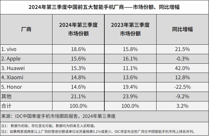 调研机构IDC给出的最新报告显示,今年三季度中国手机市场,vivo依然是第一。2024年第三季度,中国智能手机市场出货量约6878万台,同比增长3.2%,连续四个季度保持同比增长。新一轮换机周期的到来使得市场需求持续向好。