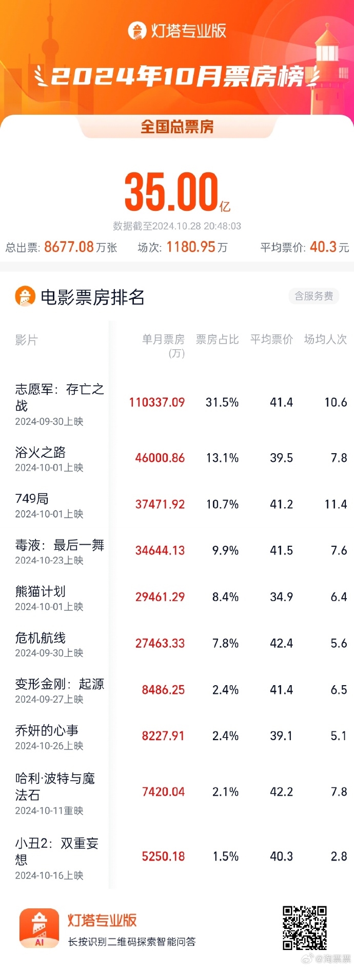 据灯塔专业版,截止今晚20时48分,2024年10月总票房(含预售)突破35亿!其中,《志愿军:存亡之战》《浴火之路》《749局》暂列票房前三位。《志愿军:存亡之战》10月票房已破11亿元,一家独占总票房31.5%,断层式领先。
