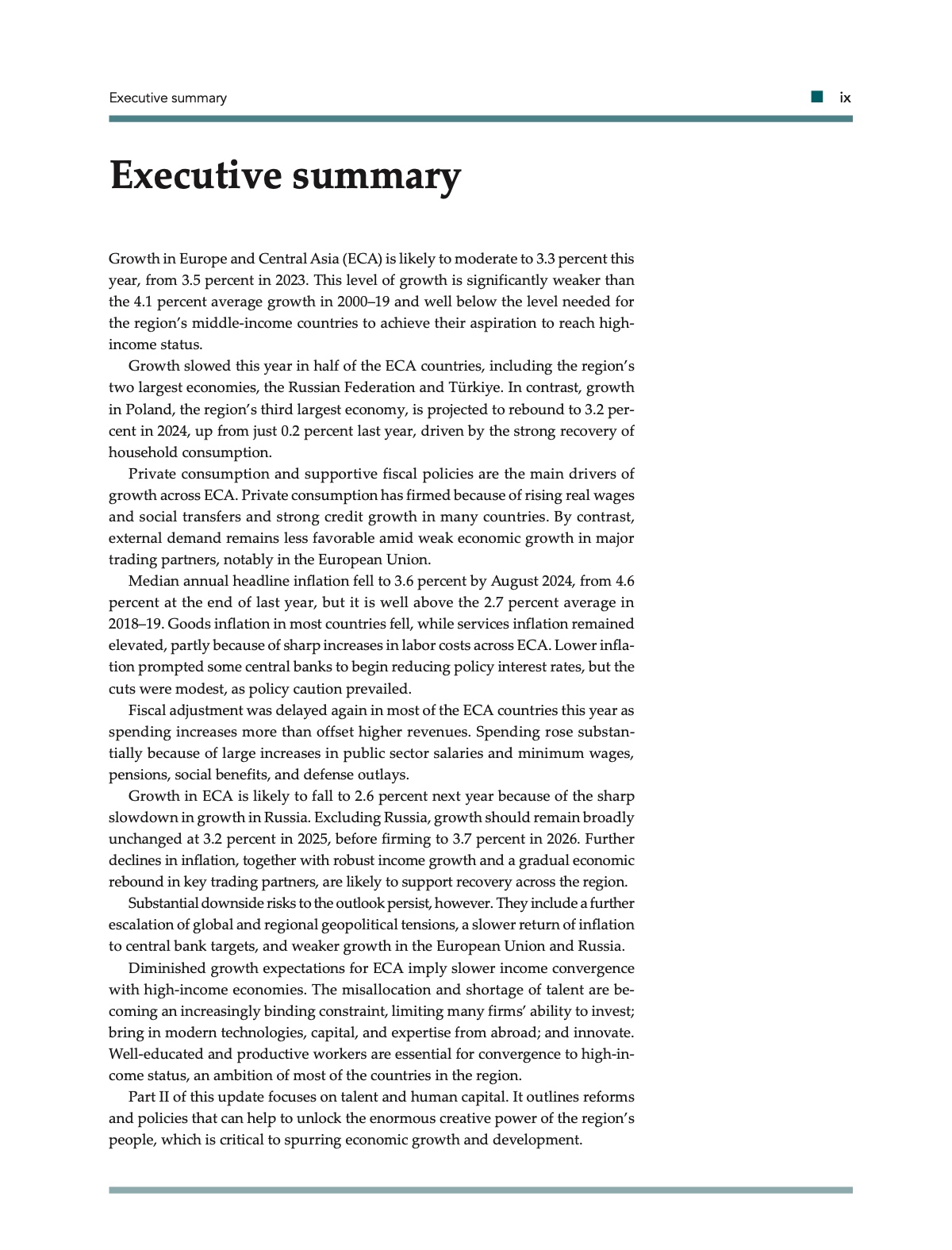 世界银行主管欧洲和中亚的副行长安东内拉·巴萨尼表示:“欧洲和中亚地区各国成功应对了最近一段时间由于高通胀、俄乌冲突以及主要出口市场欧盟增长乏力等因素造成的冲击。为在中长期实现更强劲的生产率增长,各国必须大幅提高中等和高等教育质量,这是扩大人力资本、增强创造力的关键。”