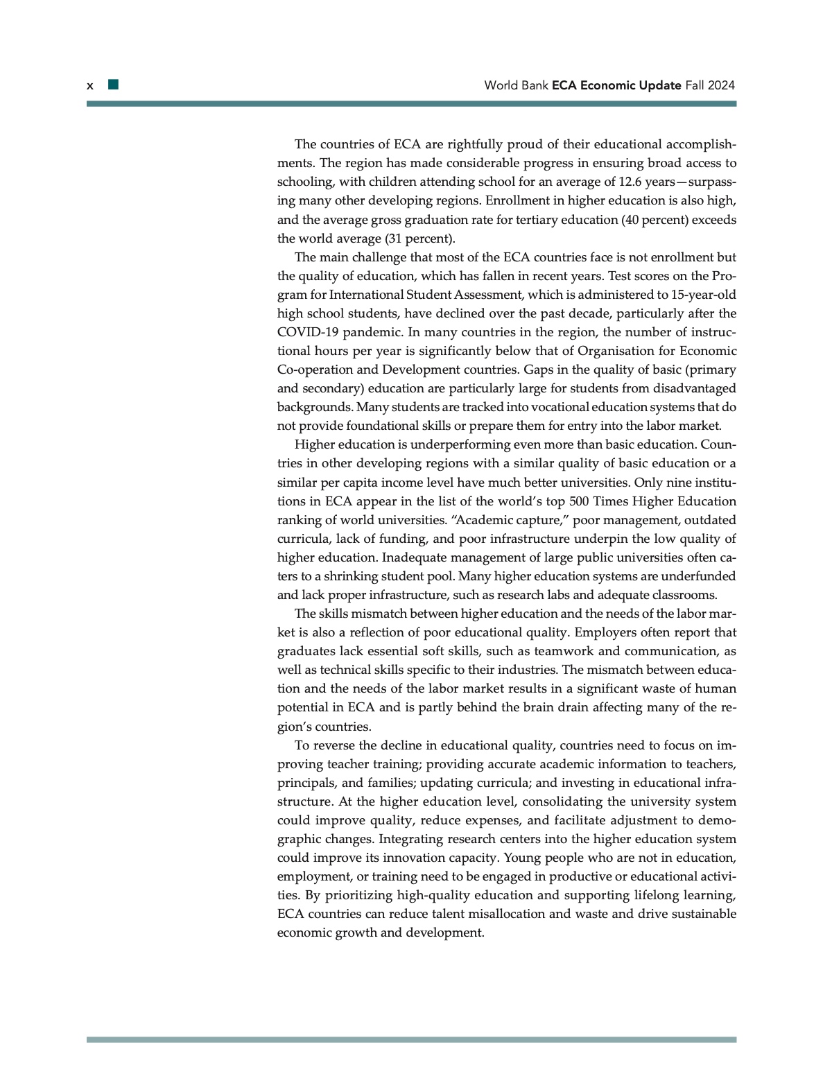 世界银行欧洲中亚地区首席经济学家伊瓦伊罗·伊兹沃斯基指出,该地区长期增长的主要潜力在于提升教育质量,尤其是高等教育水平。将教育质量提升列为首要任务,并全力支持终身学习,将有助于增加人力资本、减少人才错配和浪费,激发创新,推动经济可持续增长与发展。